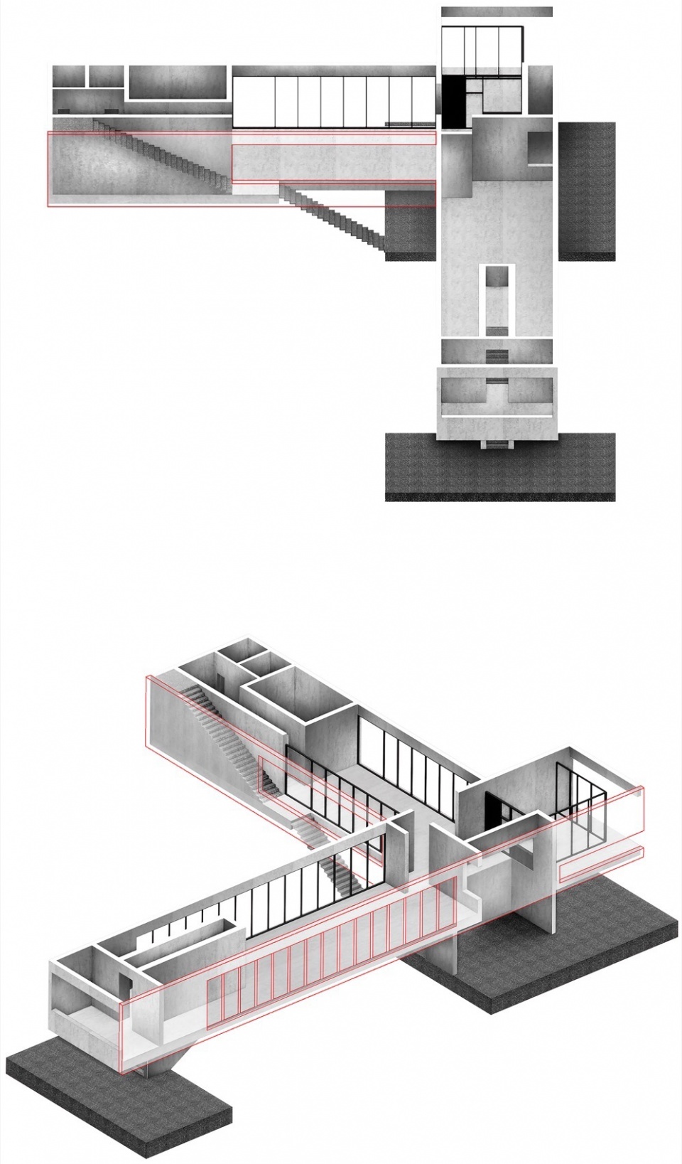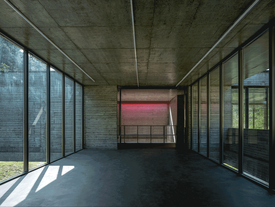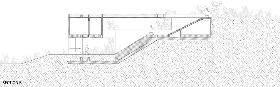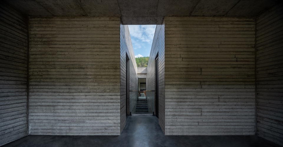 建筑屋面覆以超薄镜面水池,以削弱反梁的厚重感,使体量更为轻盈、抽象;其水平反射既与山体的复杂肌理形成对照,亦呼应远处水库。混凝土筒体为一次整体浇筑;为平衡主梁中跨弯矩,顶板与地面经计算均作微起拱,以降低早期应力与变形,保证了混凝土不会在硬化凝固的过程中开裂。在自然界的杂乱无章之中,一座桥梁就是一处几何学的领地。