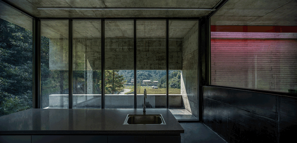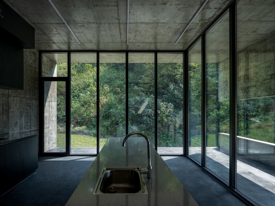 ▼开敞厨房里,混凝土与玻璃在光影中相互映照,Concrete and Glass Interplay in Light and Shadow Within the Open Kitchen