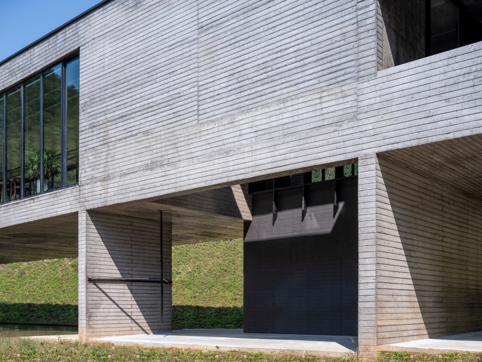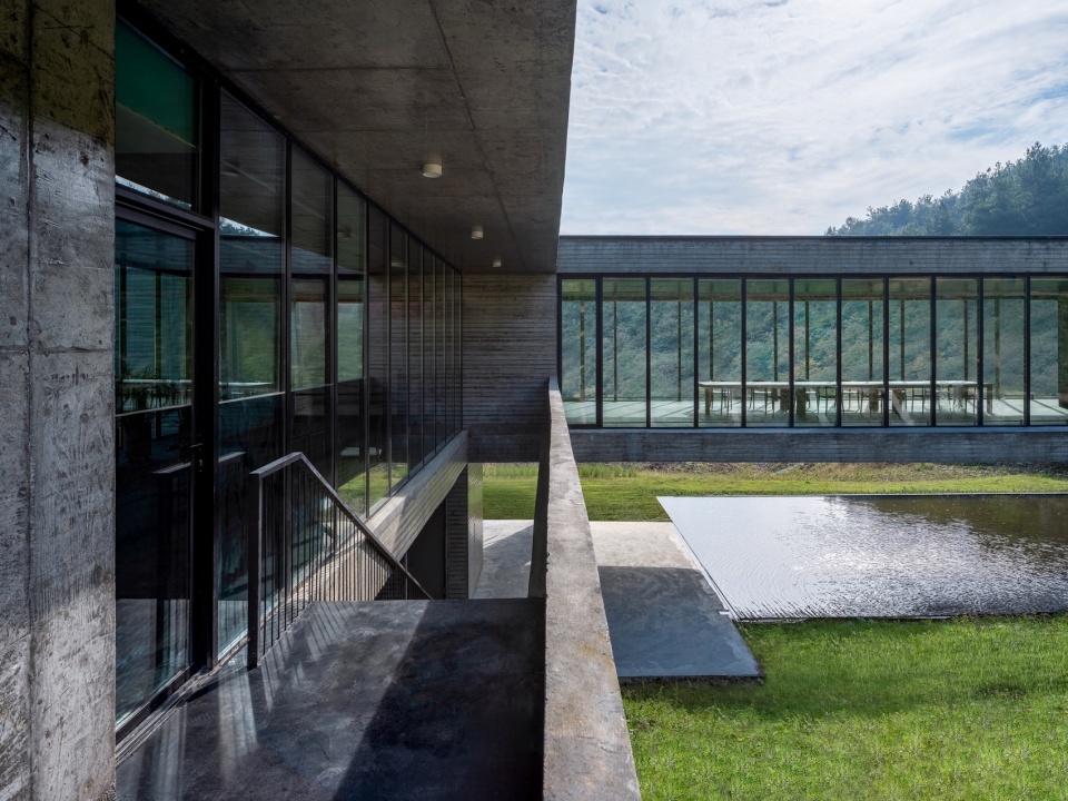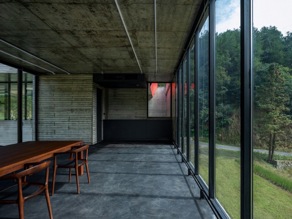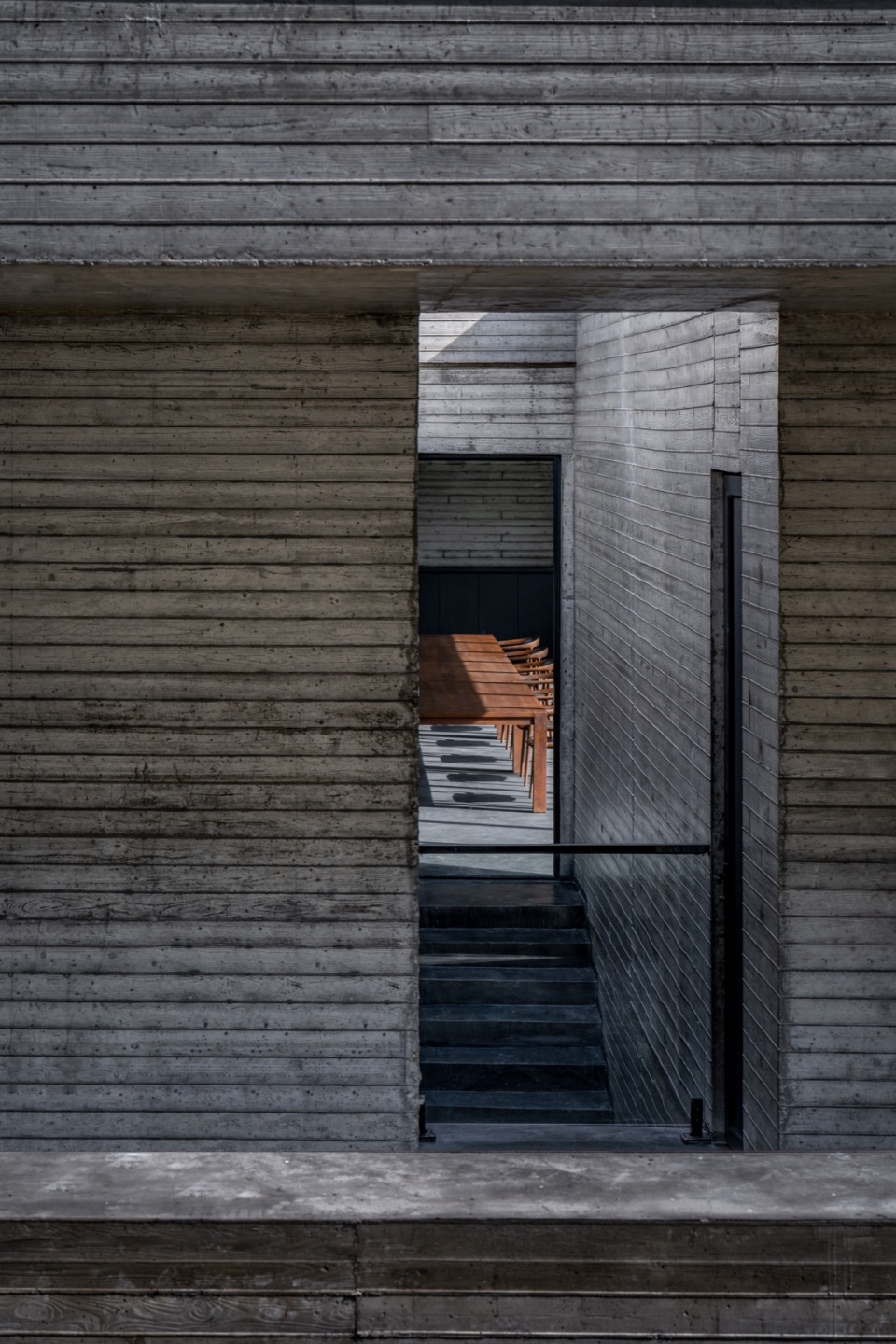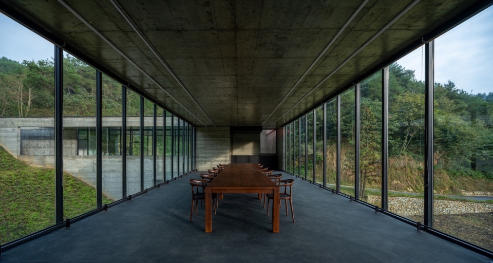 The roof is topped with an ultra-thin reflecting pool, softening the visual weight of the inverted beams and lending the volume a lighter, more abstract presence. Its horizontal mirror contrasts with the rugged textures of the surrounding mountains, while also echoing the distant surface of the reservoir. The concrete shell was cast in a single pour. To balance the mid-span bending moments of the main beams, both the roof and floor slabs were designed with a slight upward camber. This subtle adjustment minimizes early-stage stress and deformation, preventing cracking during the curing process. Amid the natural world’s irregularity, the building stands like a bridge—a precise geometric territory carved out of chaos.
