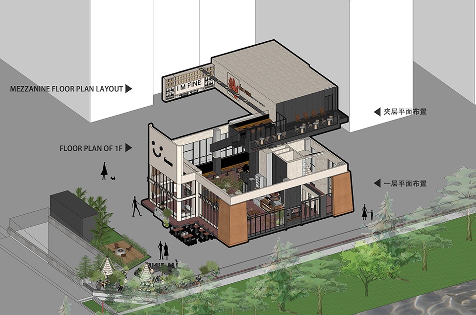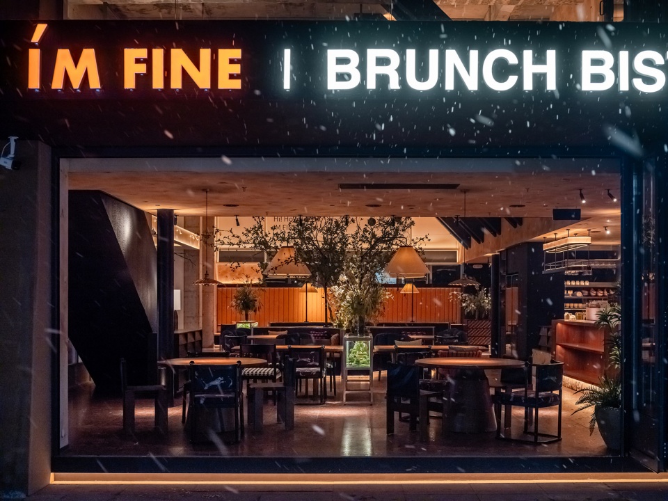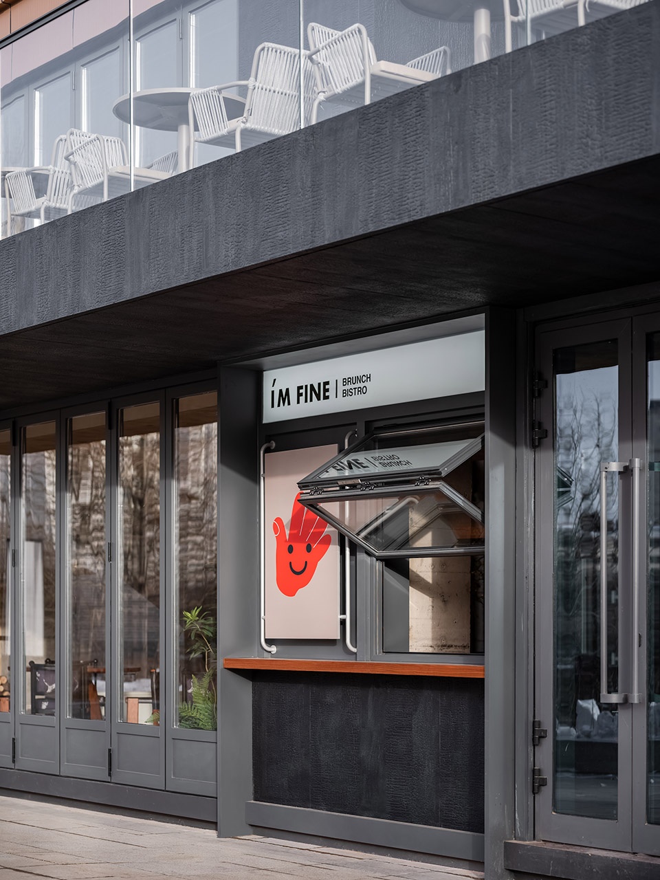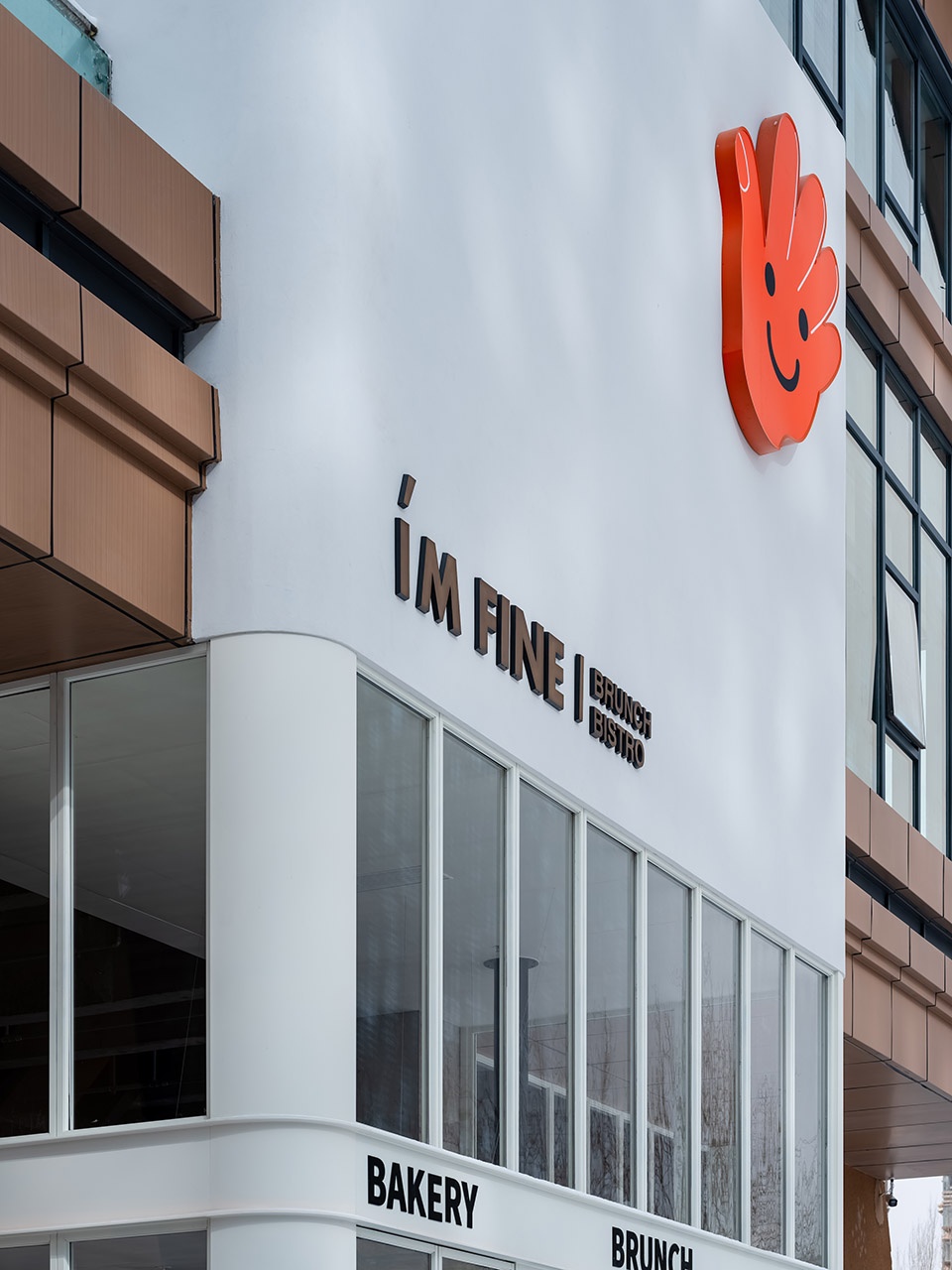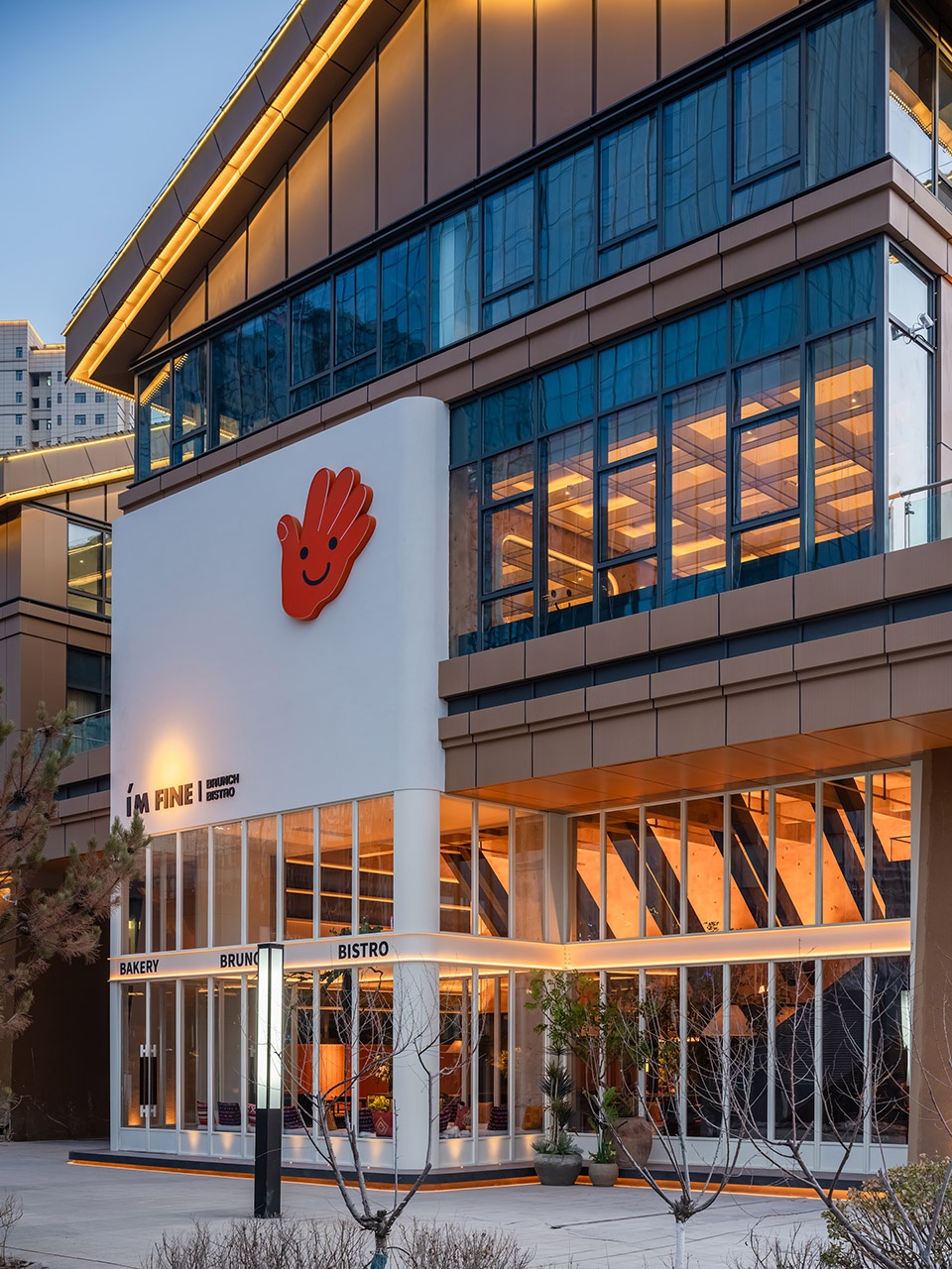 As the brand’s first store in the city of Xining, firstly, we hoped that IM FINE would have a “say hello” interaction with the city. Therefore, the design extended a large-scale display surface made of white steel plates and glass on the north facade of the building. The height of the display surface was carefully considered to ensure that people on the pedestrian bridge—an important hub for street traffic—could notice this “big hand” sign. A wave, a smile, represents the restaurant’s friendliness towards the city and the neighborhood. The light and lively sign also aligns with the restaurant’s positioning towards a younger target demographic.