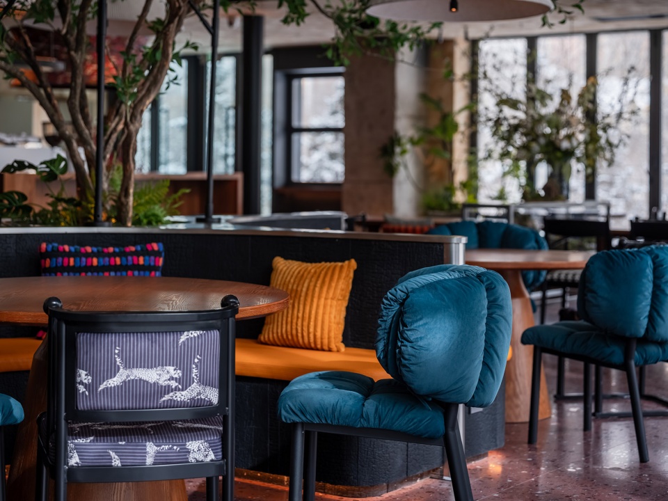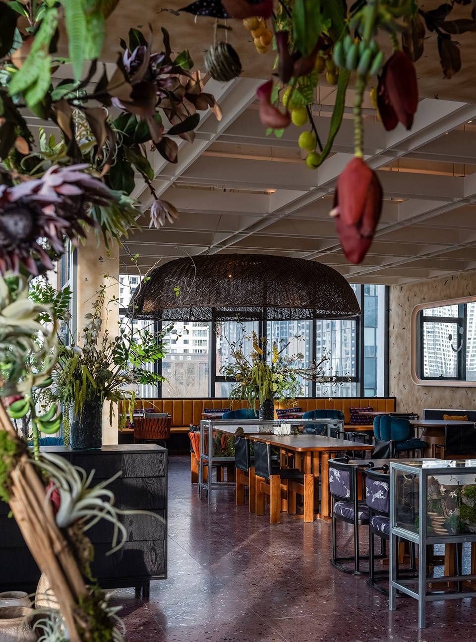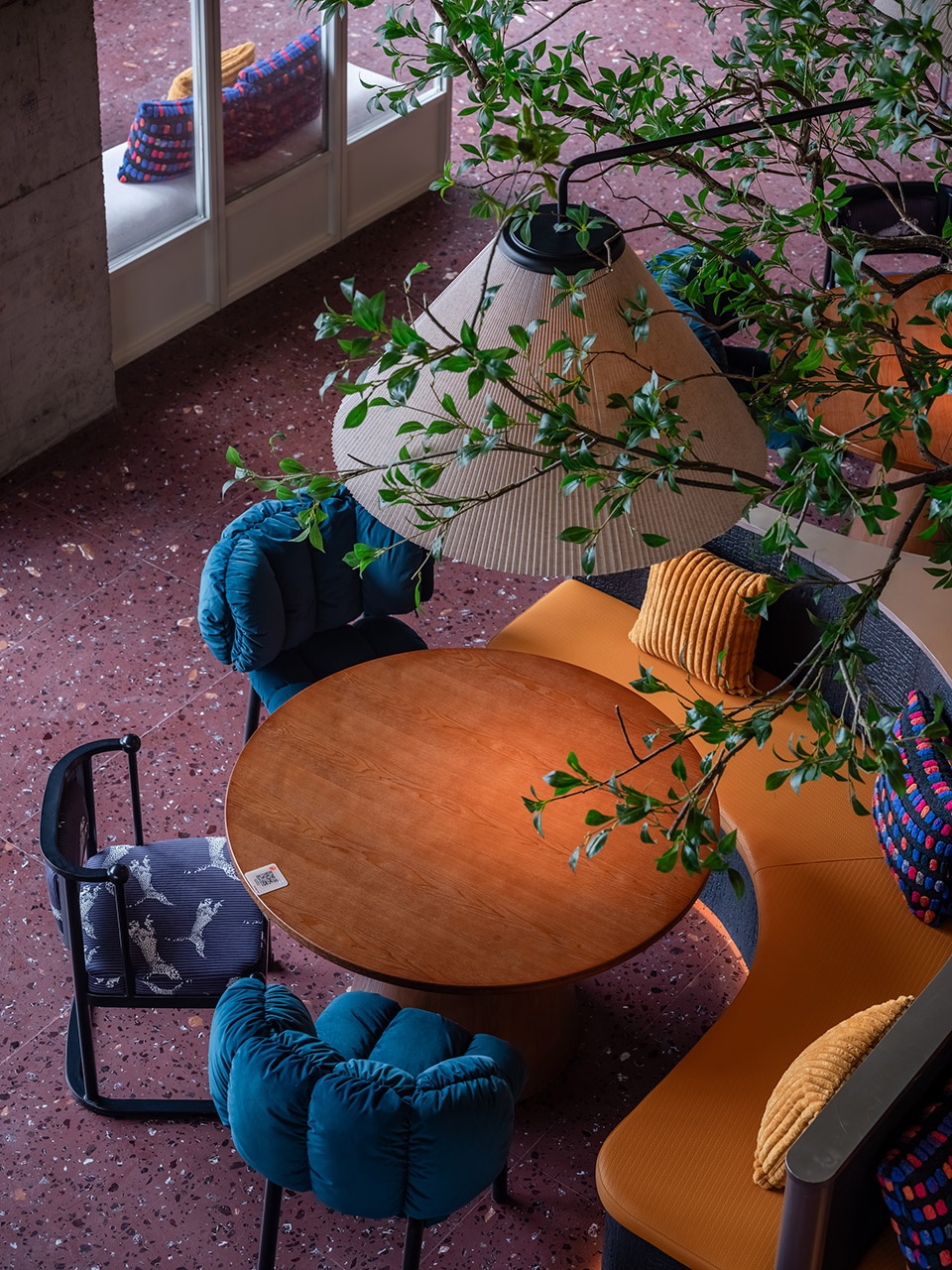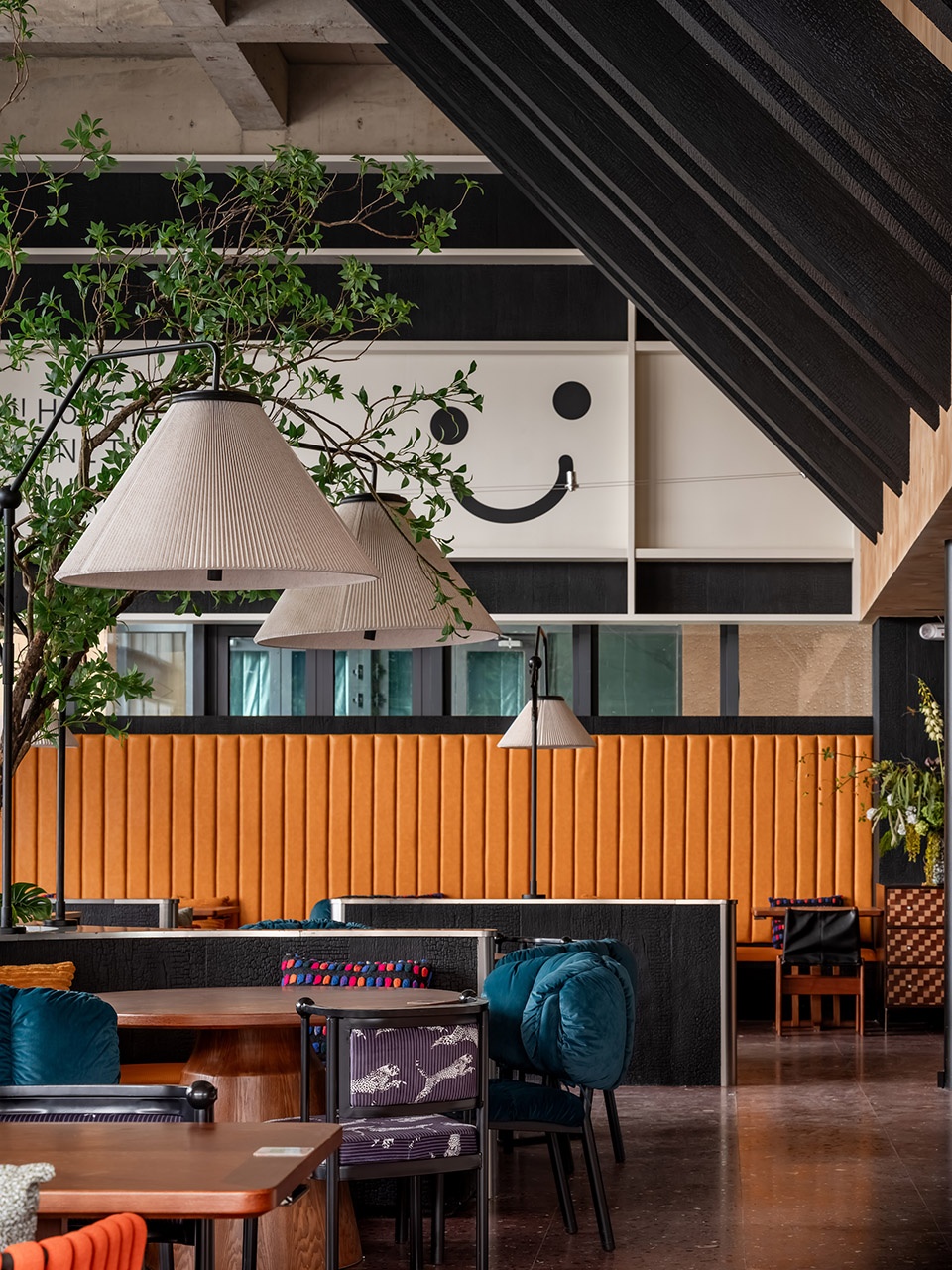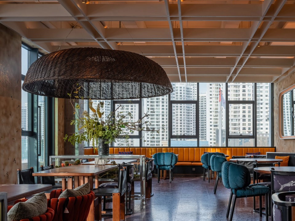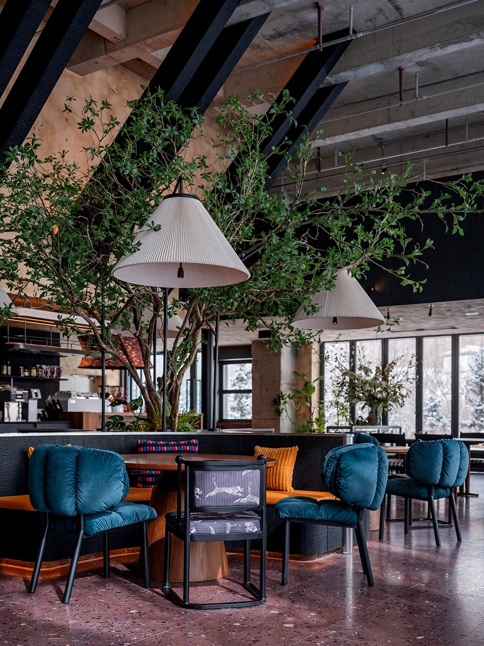 Furthermore, tall tree elements and large suspended lamps also provide a natural sense of shelter, creating rich visual interplays within the open layout. Arc-shaped banquettes and semi-enclosed seating are all developed around a more comfortable sense of enclosure.