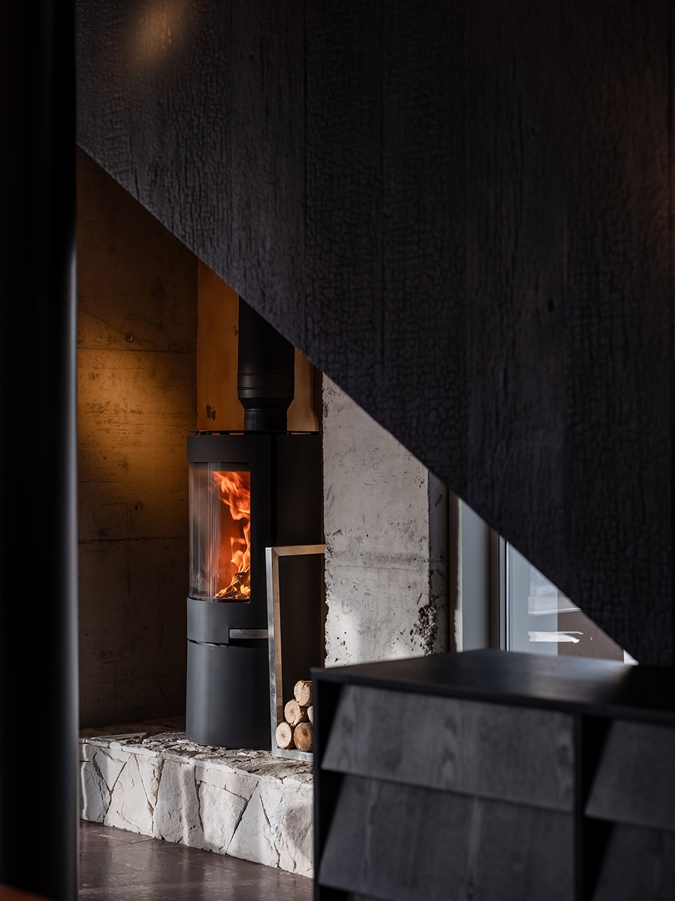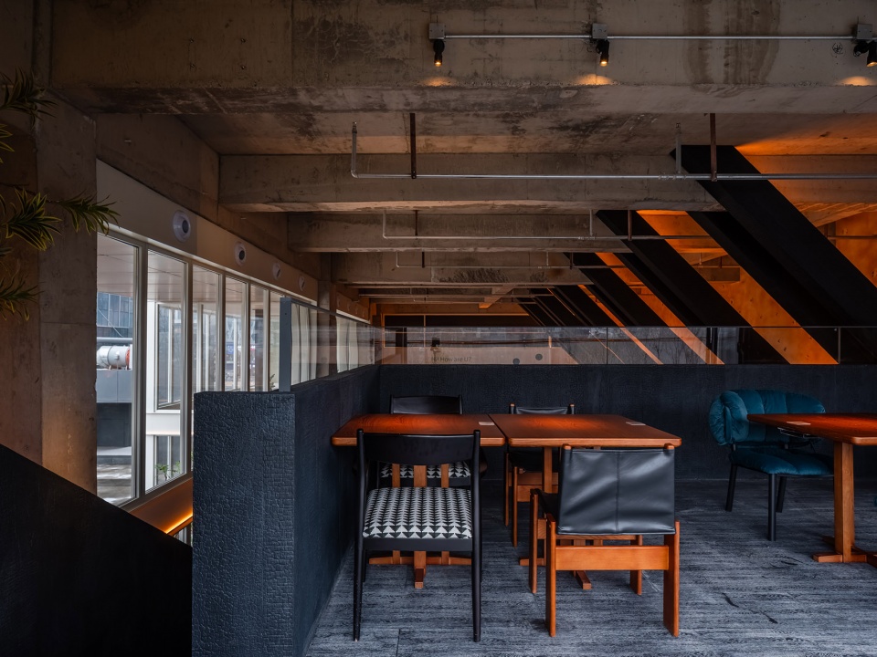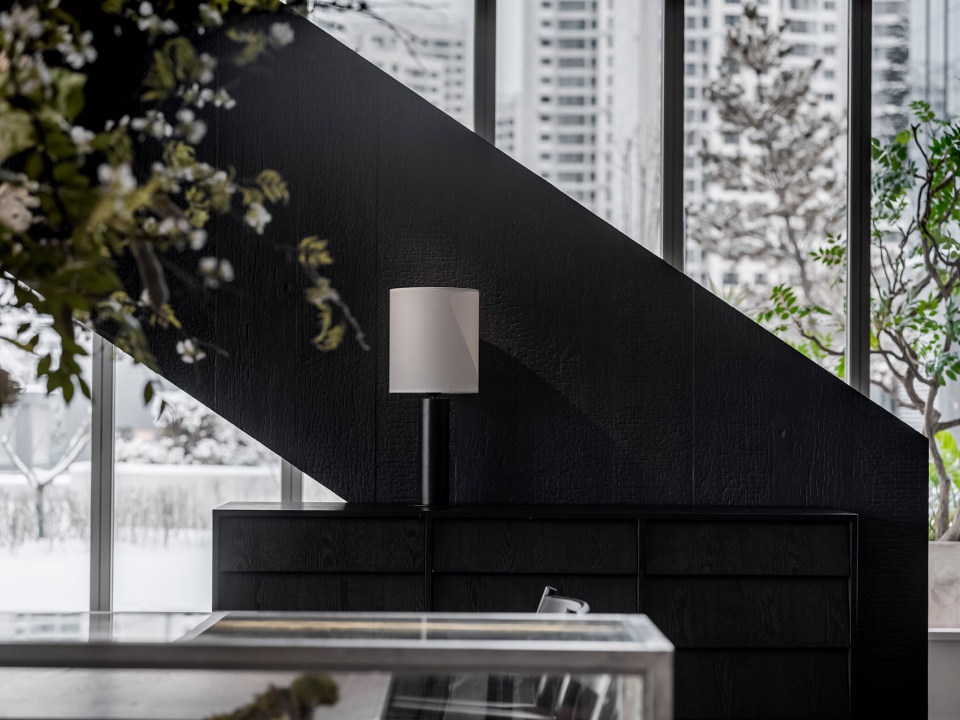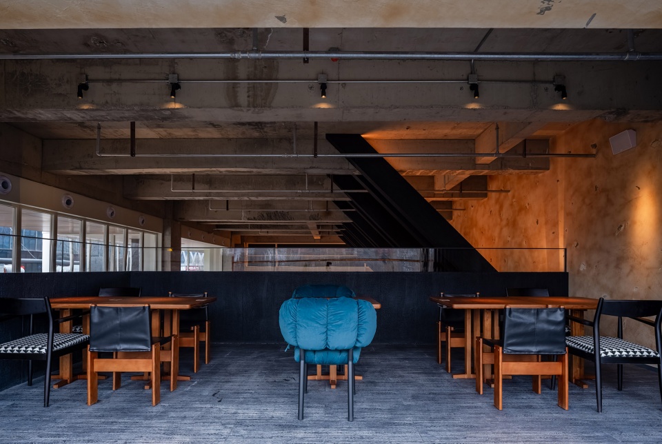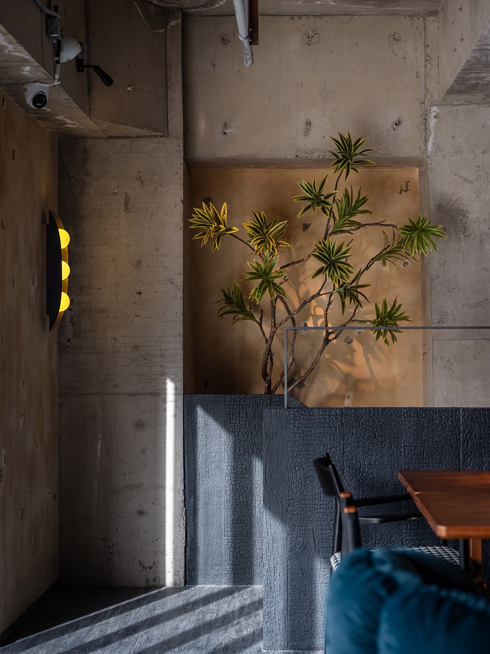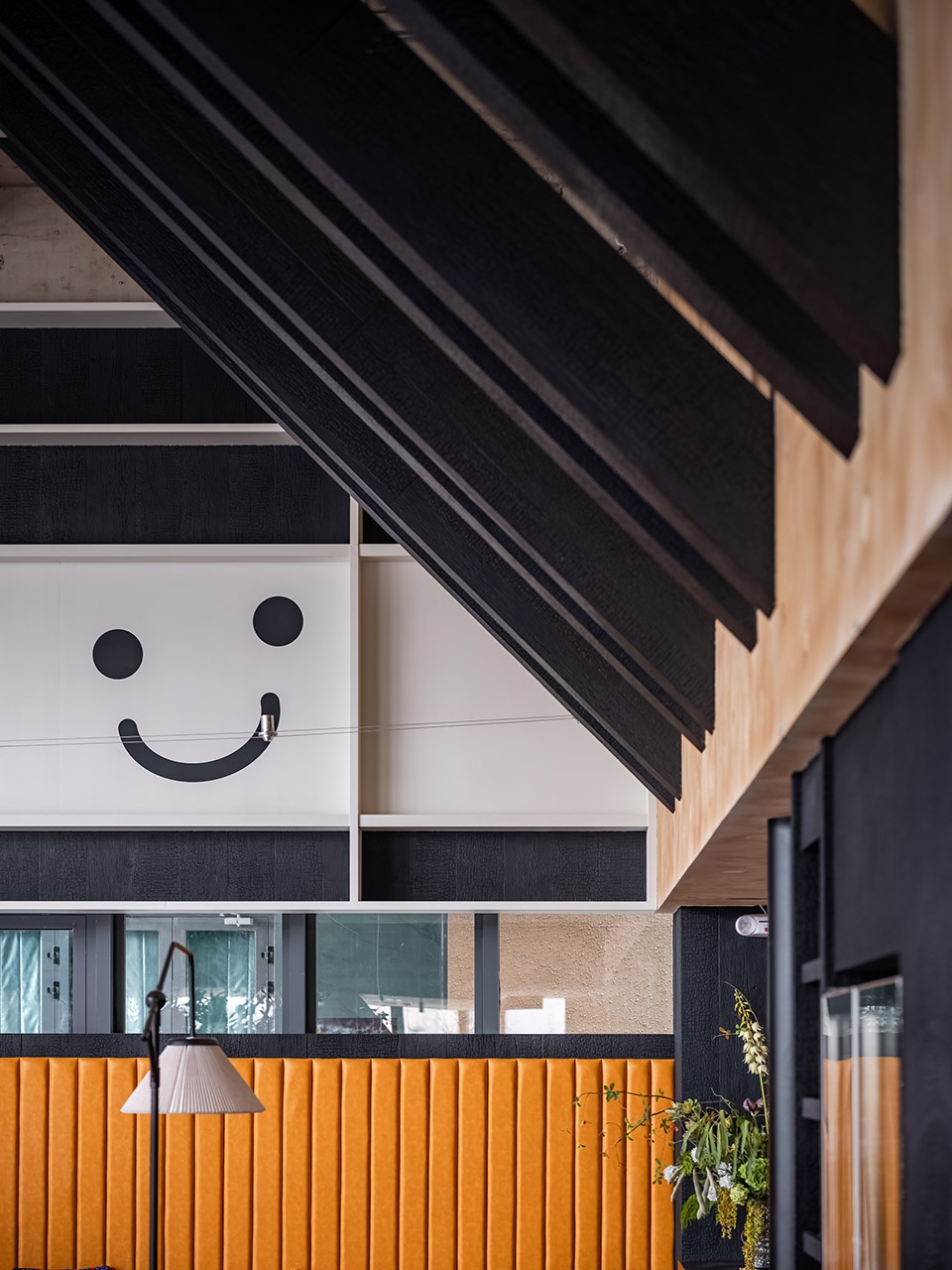 Therefore, we erected multiple structural oblique supports with a burnt board texture in the first-floor space. This both visually influences the spatial sense of scale and creates structural tension.