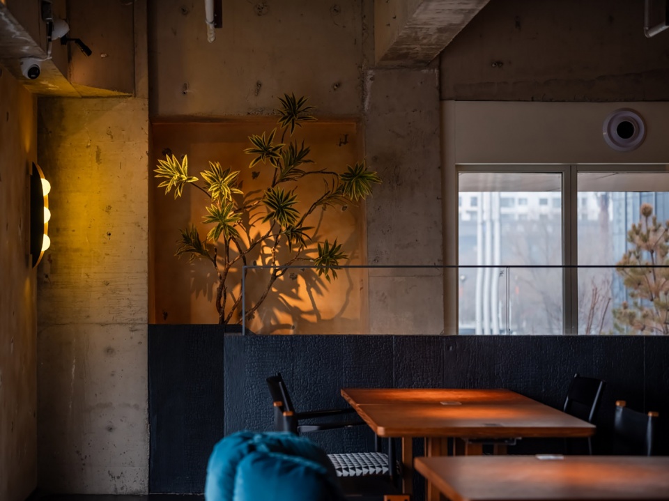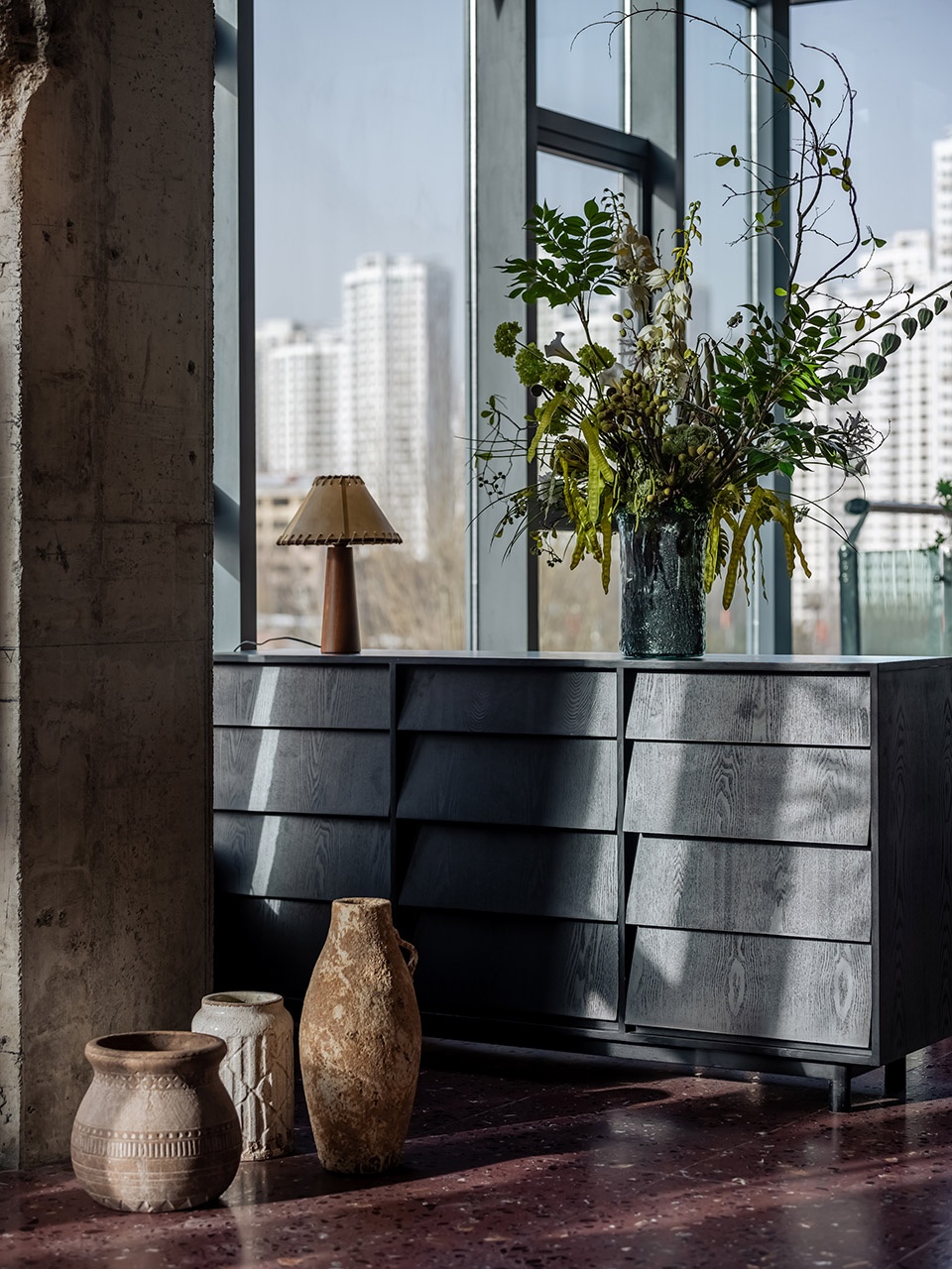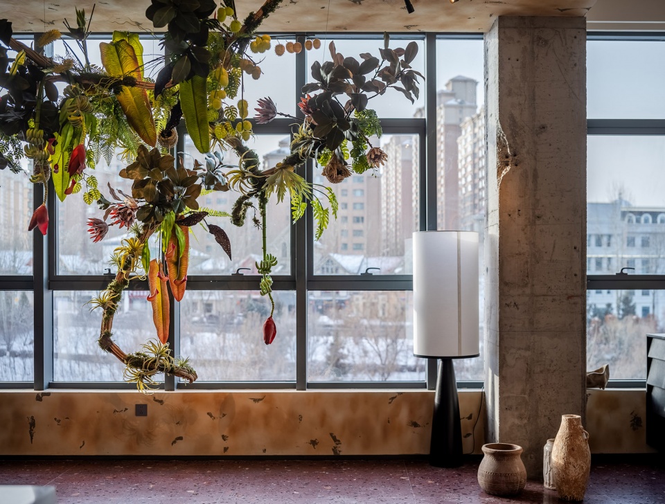 西宁冬季寒冷,窗外的松林景观,启发设计对空间森自然系氛围的营造。我们联手虫椿洲艺术设计师孙小诗,在空间不同点位打造了花艺装置和花草植物景观。