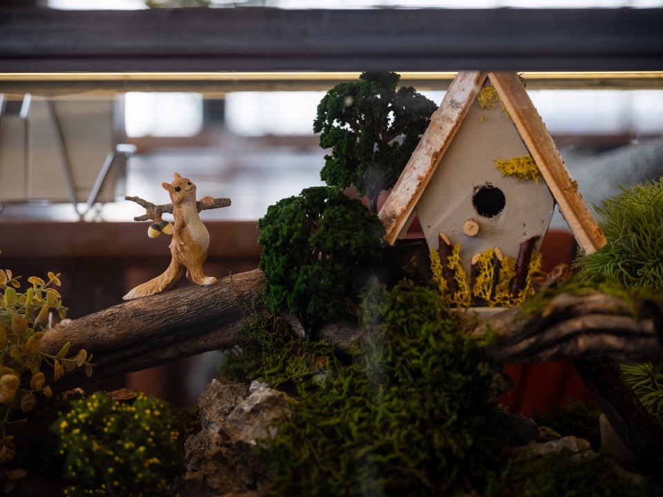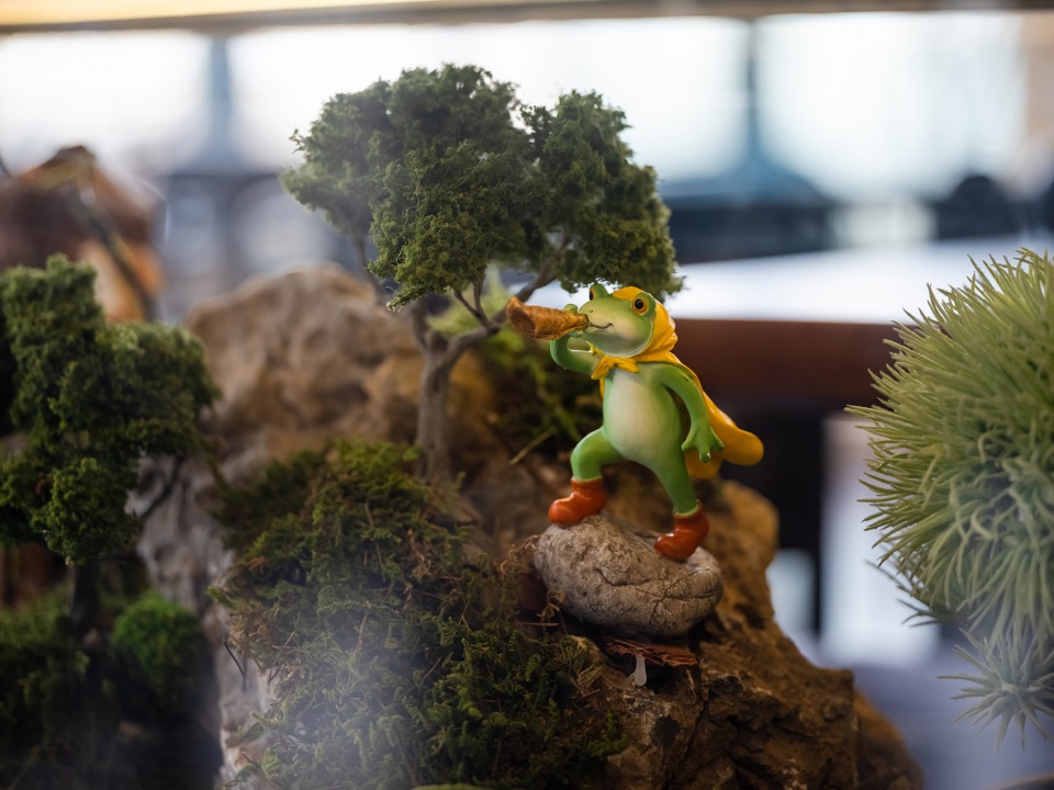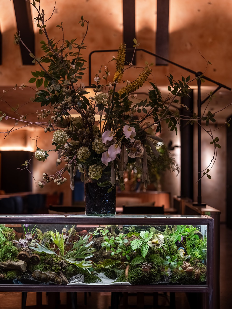 对细节的注重,能带来更加微小的感受,设计师孙小诗为餐厅打造了多组植物微景观,玻璃柜里的缩微景观有着不同的故事脉络,生动有趣,来到餐厅的客人可以关注、停留、探索,加深对空间的记忆。