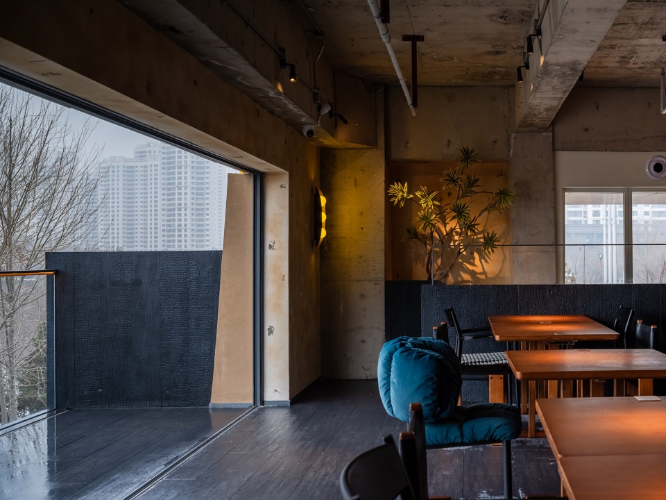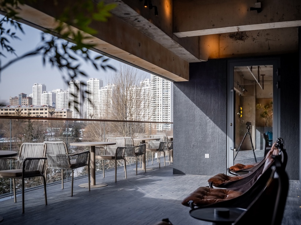 Northern China unique pine tree landscape are planted outside the pedestrian walkway on the west side of the building. Combined with the ample sunshine brought by the plateau climate, we replaced the original wall with foldable glass doors to blur the boundary between inside and outside, allowing light, air, and the landscape to fully enter the interior.