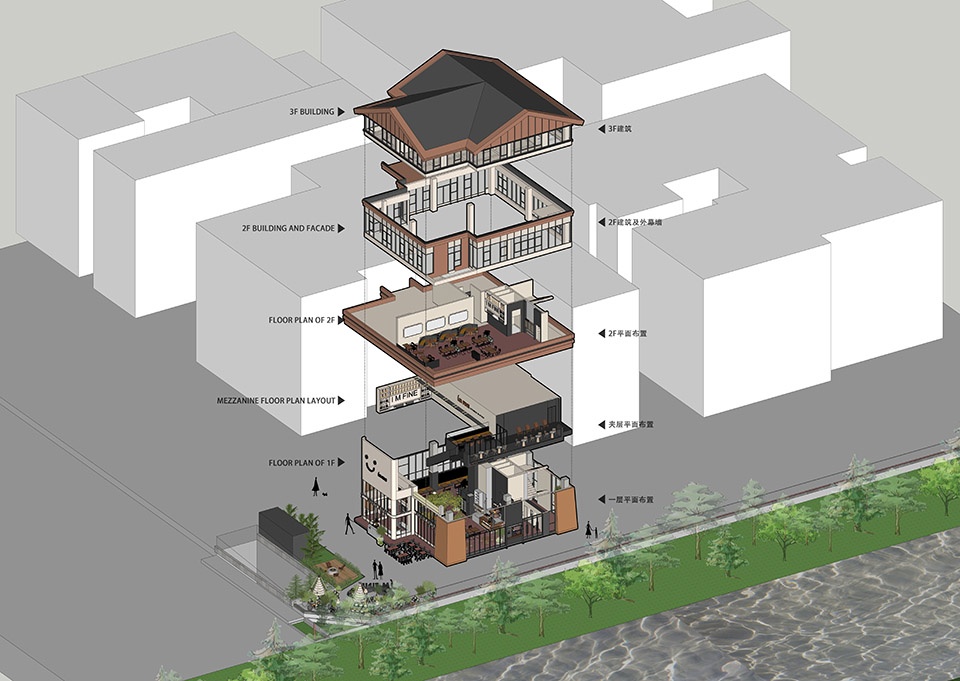The project occupies the three-story space of the entire building. The first floor and part of the second floor are open to the public as the restaurant, while the second and third floors also serve functions of baking, office, and storage. The first-floor site has a floor height of 6.4 meters. To utilize the site reasonably and increase seating, we built an L-shaped mezzanine space in the west and south areas of the first floor. The mezzanine extends outward on the west side to form a cantilevered balcony. The cantilevered balcony can connect with the indoor mezzanine area, combining to form a relatively private independent area, providing possibilities for hosting banquets and small events.
