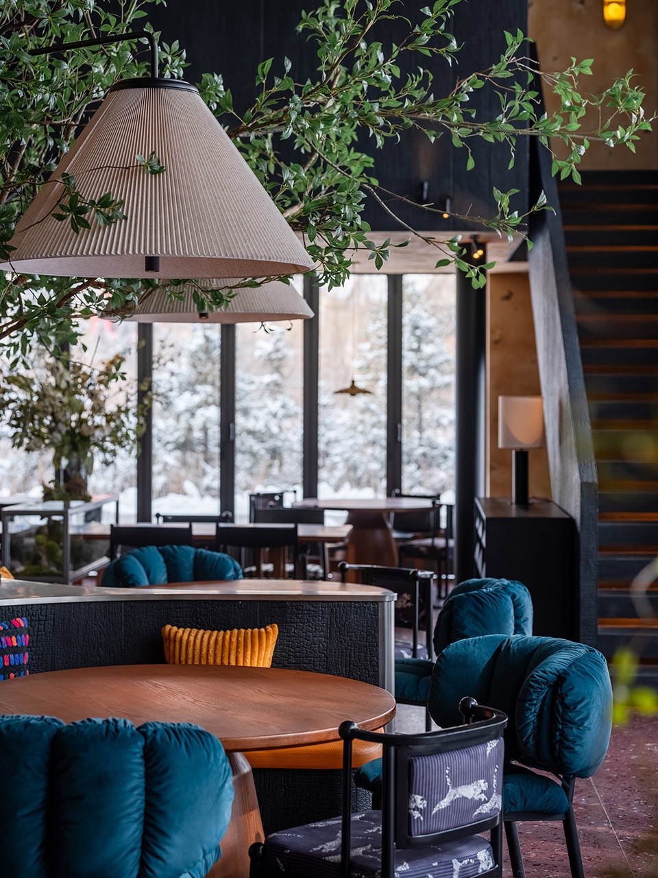 On the project’s photography day, a heavy snow suddenly fell in the sky of Xining. The snow-covered pine forest shone into the restaurant from the west side, accompanied by the roaring indoor fire. A feeling of crispness and warmth permeated the space. This is the unique characteristic of the IM FINE restaurant in the city of Xining: within the purity of the high plateau, there is a warm and lazy corner waiting for the arrival of diners. The spatial sensation brought by the snowscape signifies that we have achieved the project’s design original intention to extend the brand’s spatial tone, add natural attributes by integrating with the surrounding pine forest landscape of the site, and complete a localized design expression in response to the regional characteristics of Xining, Qinghai.