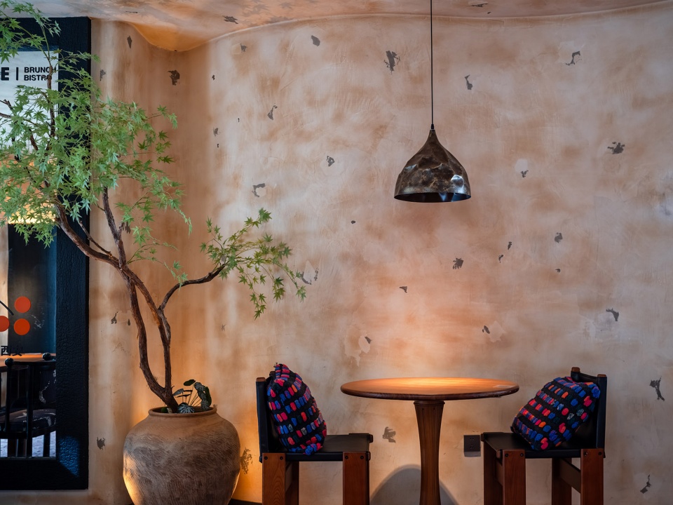 此外,高大的树木景观和大尺寸悬吊的灯具,也有着天然的遮蔽感,又在开敞的布局中,产生丰富的视觉穿插关系;弧形卡座、半包围式的座椅,均是围绕着更加舒适的包裹感而展开。