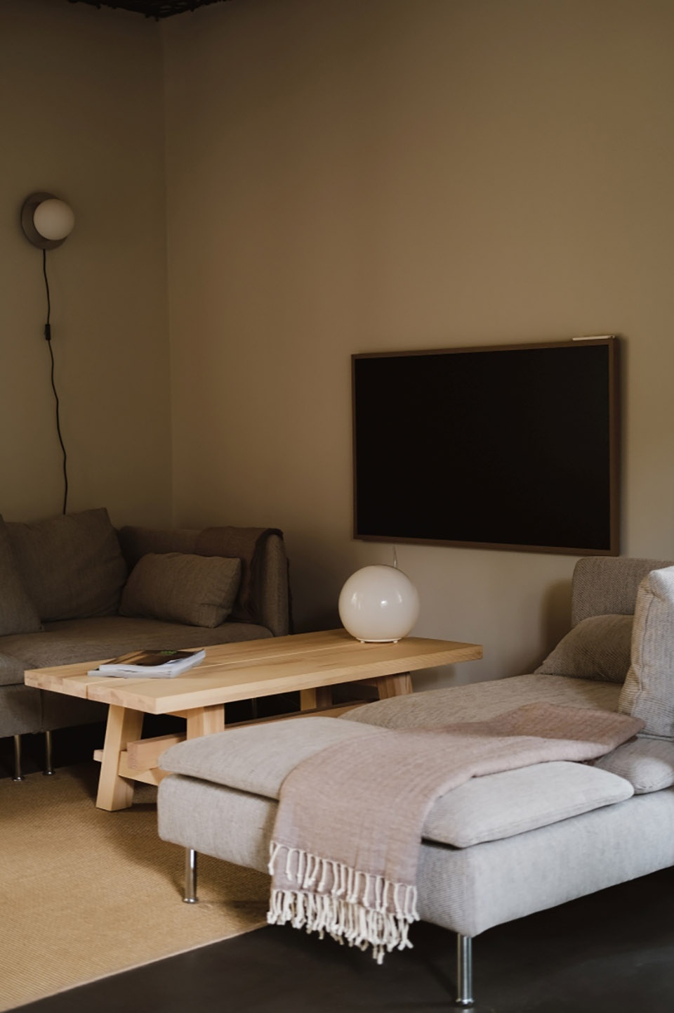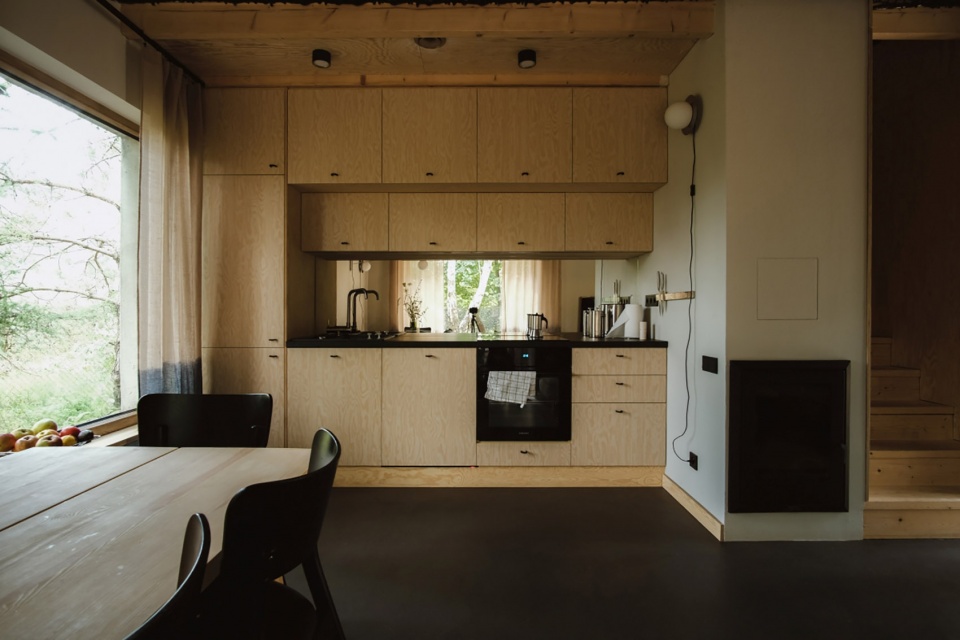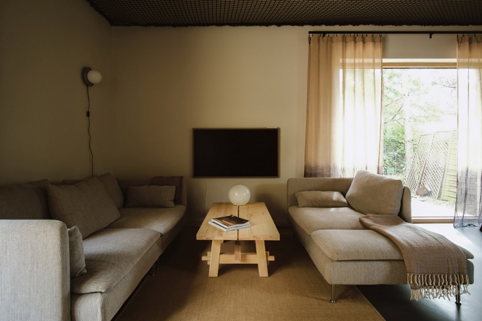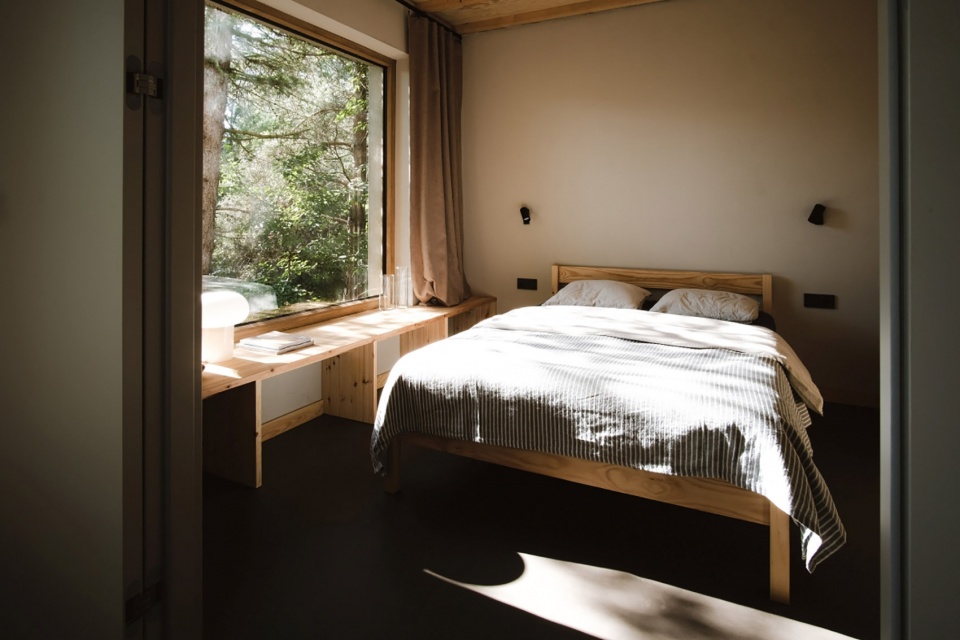 All rooms are finished in a calm palette of beige and gray, warmed by natural wood. Raw textures are balanced with black accents – the kitchen countertop, chairs, and sections of flooring. The result is an atmosphere of holiday lightness, expressed in a modern, minimalist form.