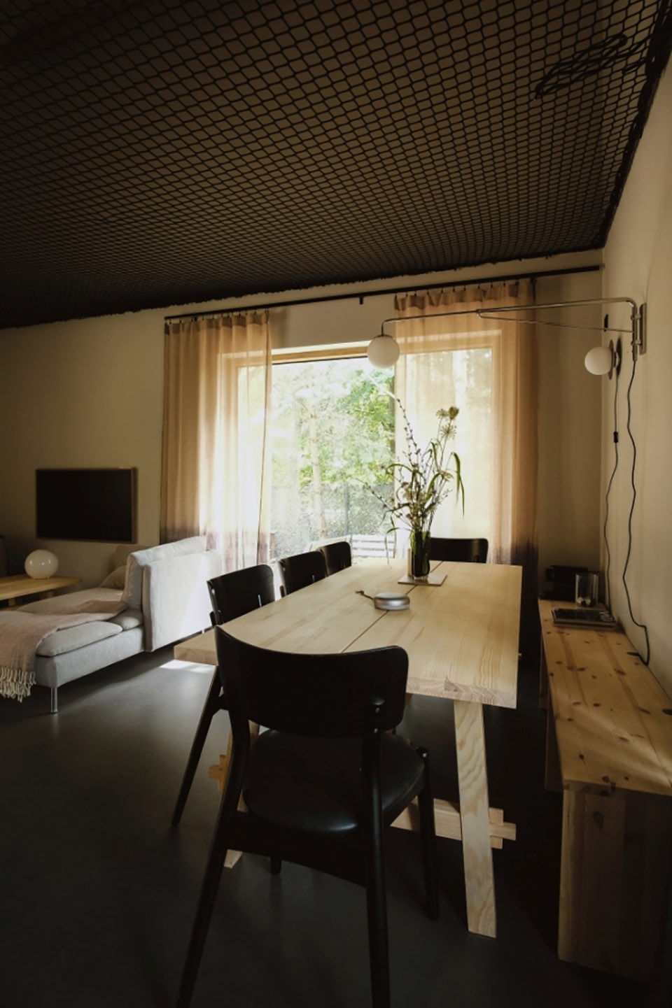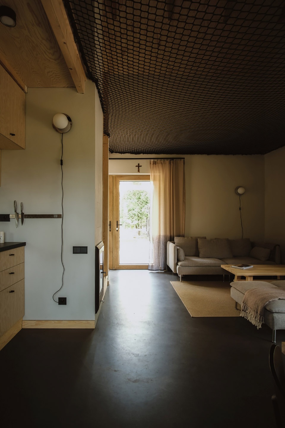 The family home is a space for togetherness and unhurried relaxation away from the city’s bustle. Inside are three bedrooms, two bathrooms, and a living room connected to the kitchen and dining area. Above the living room, a unique element was introduced – a net-trampoline, where one can relax several meters above the ground. Designed with the youngest residents in mind, it serves as a safe play area for jumping and fun, while also offering adults a space for rest and a new perspective on the interior.