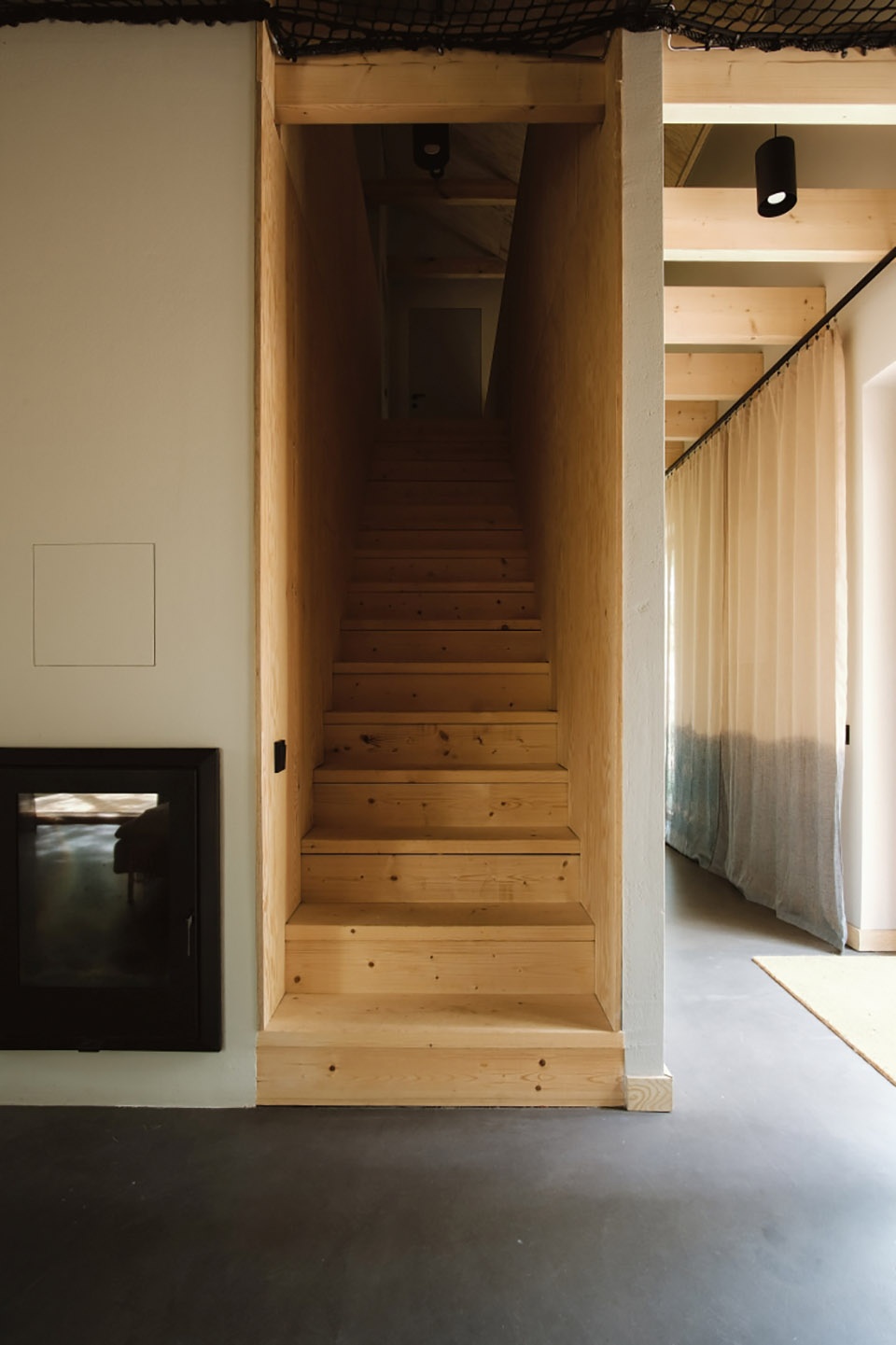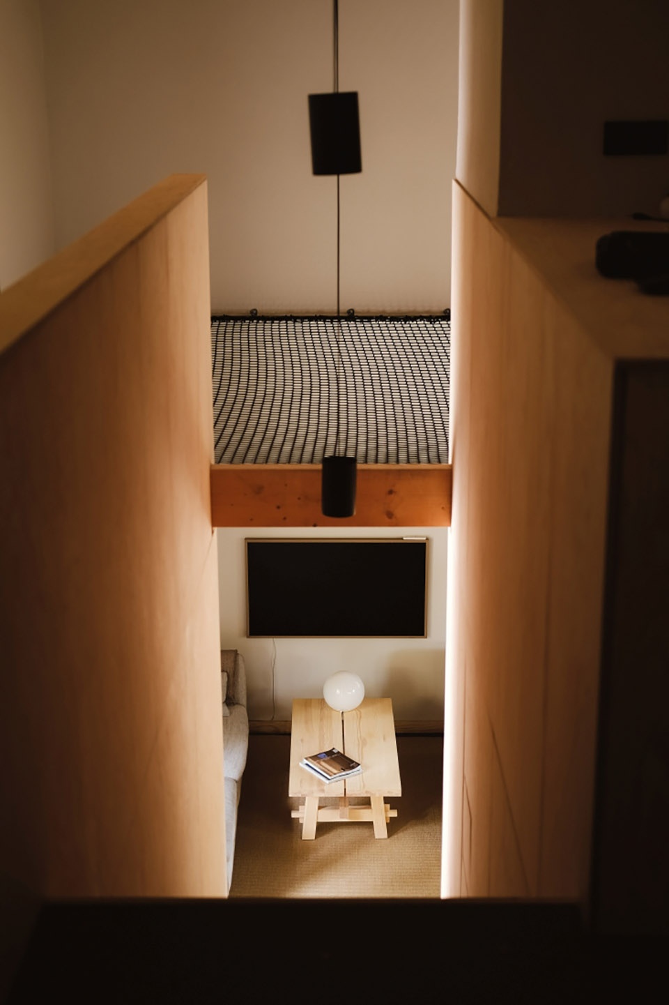 这座家庭住宅是一个远离城市喧嚣的团聚与悠闲之所。内部设有三间卧室、两间浴室,以及与厨房及餐厅相连的客厅。客厅上方引入了一处独特的元素:网状蹦床,让居住者可以在几米高空放松,既为年幼的孩子们提供了安全的跳跃和玩耍空间,也为成年人带来了新的休憩体验与不同视角。