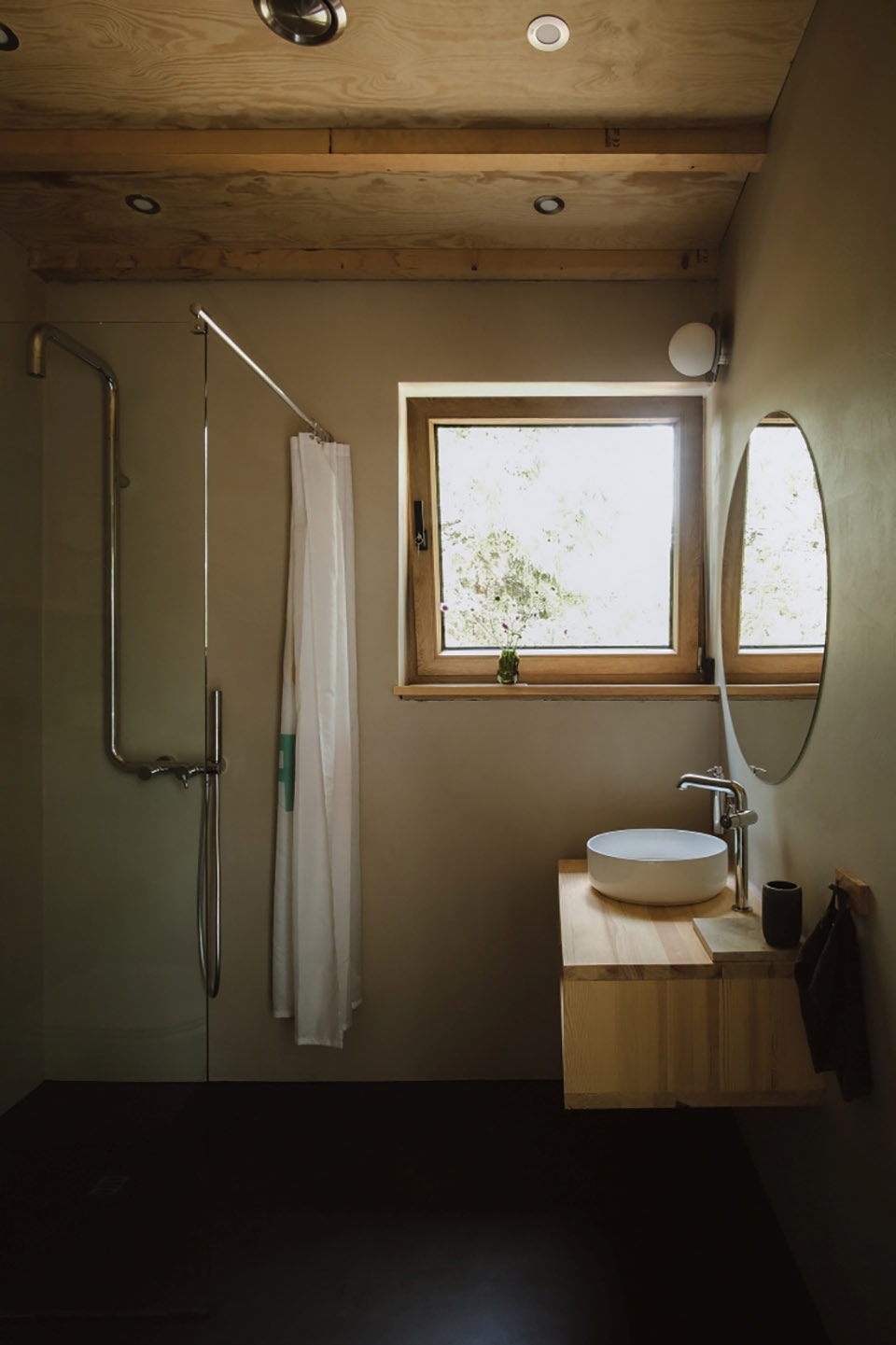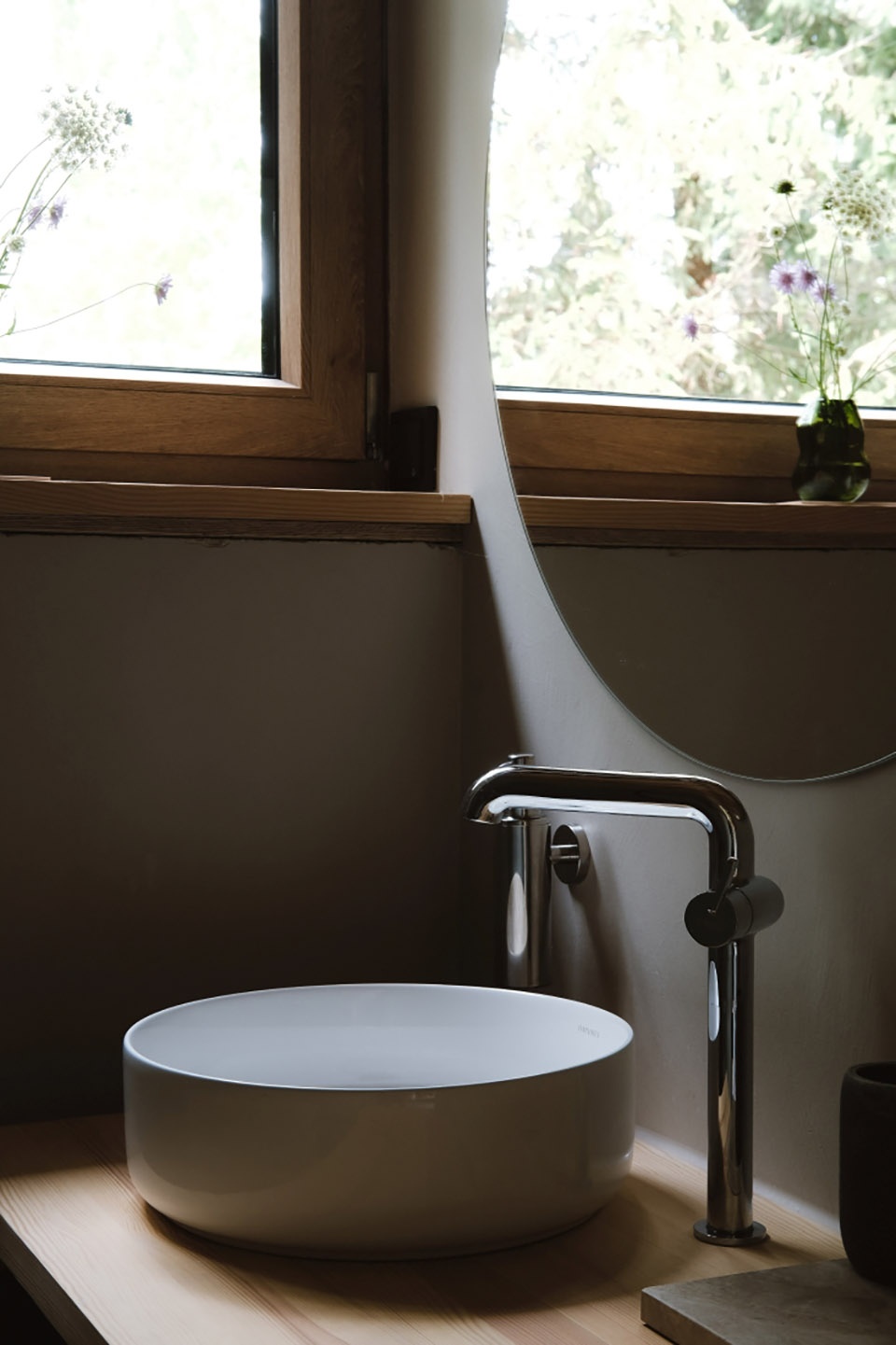 The house features two intimate yet highly functional bathrooms. Both are designed in a bright, soothing palette with wooden built-in elements. A highlight in both spaces is the Silia collection fittings from Deante Design Studio – a shower set with a rainfall showerhead and mixer, as well as a tall washbasin faucet with a rectangular spout.