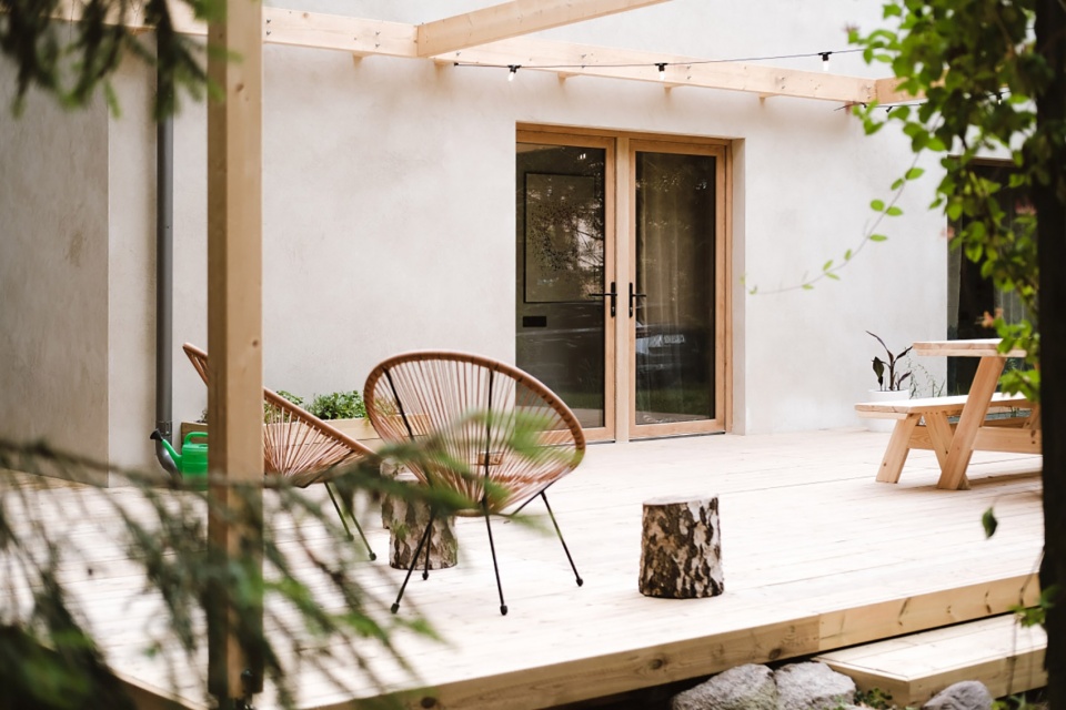 This project is more than a holiday retreat. It is a space designed for shared moments, open to nature, and ready to serve future generations. A wooden terrace with a large table and comfortable armchairs becomes a gathering place for family, while the large glass surfaces allow enjoyment of nature even on cooler days.