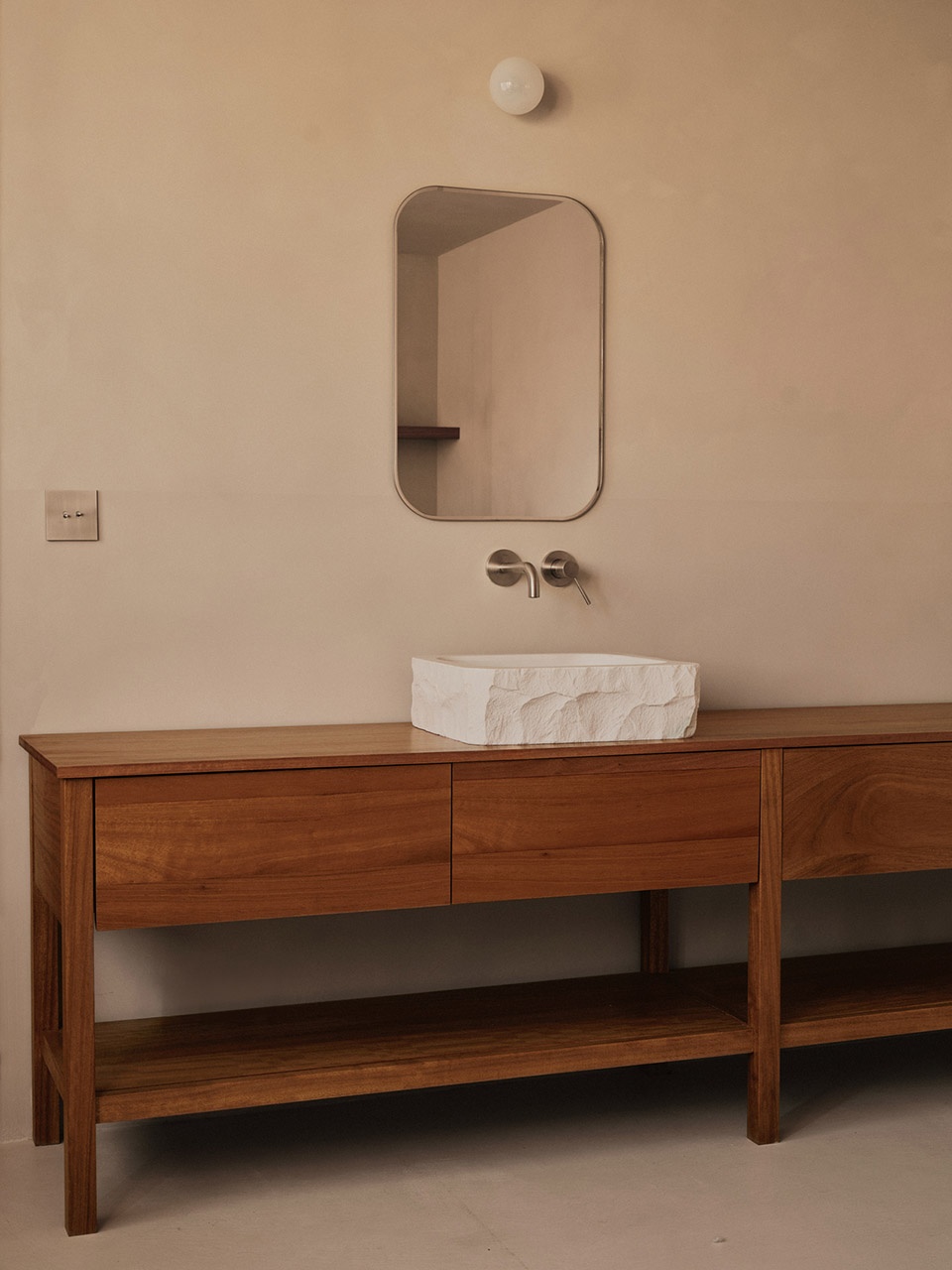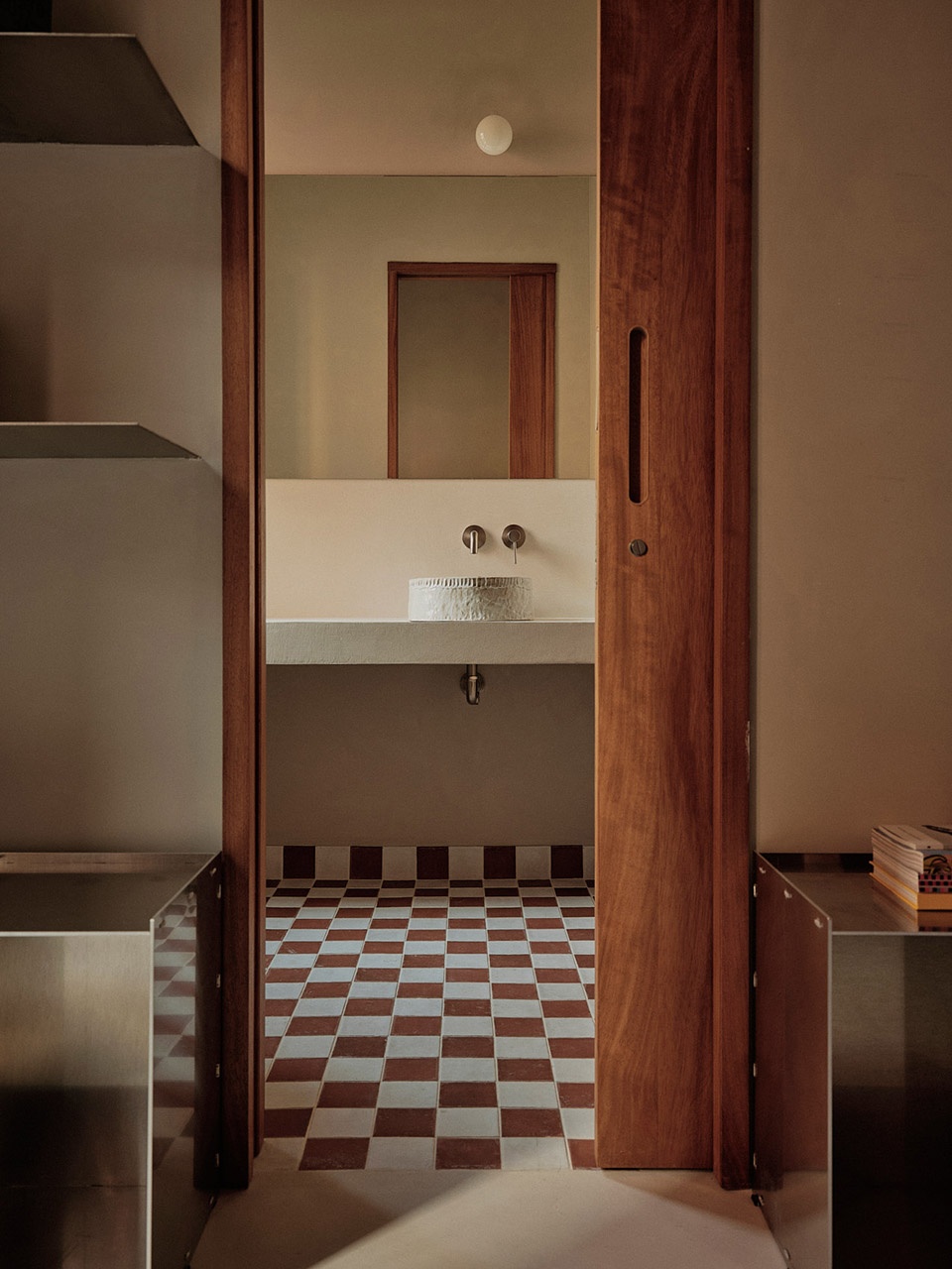 Collaboration has been key to the project’s identity. The interior carpentry was carried out by OVEN, a brand that designs and handcrafts furniture, objects, and spaces. They contributed pieces from their main collection, such as lamps and tables, and developed bespoke elements including the solid iroko kitchen, the doors, the workta- bles, and the pink showroom table that has become a signature piece of the space. All were made by hand with meticulous attention to detail. Artisan Pablo Bolumar desig- ned the beeswax chandelier at the entrance, while Estudio Vernís created both the star-shaped lamp and the bespoke washbasins.