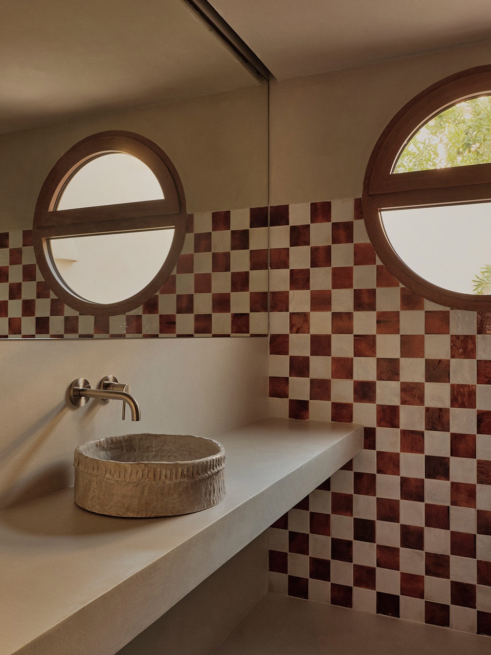 A defining feature of the renovation is the reinterpretation of the original checkerboard hydraulic tiles that once covered the floors of the house. While the originals could not be preserved, new tiles with the same motif were introduced, keeping the memory of the pre-existing home alive within a contemporary design.