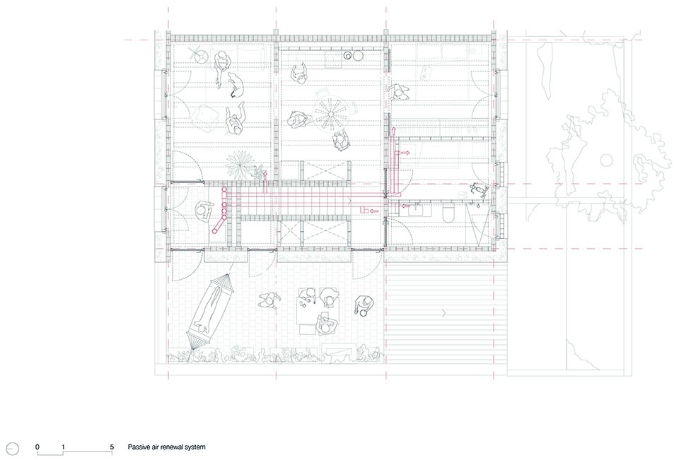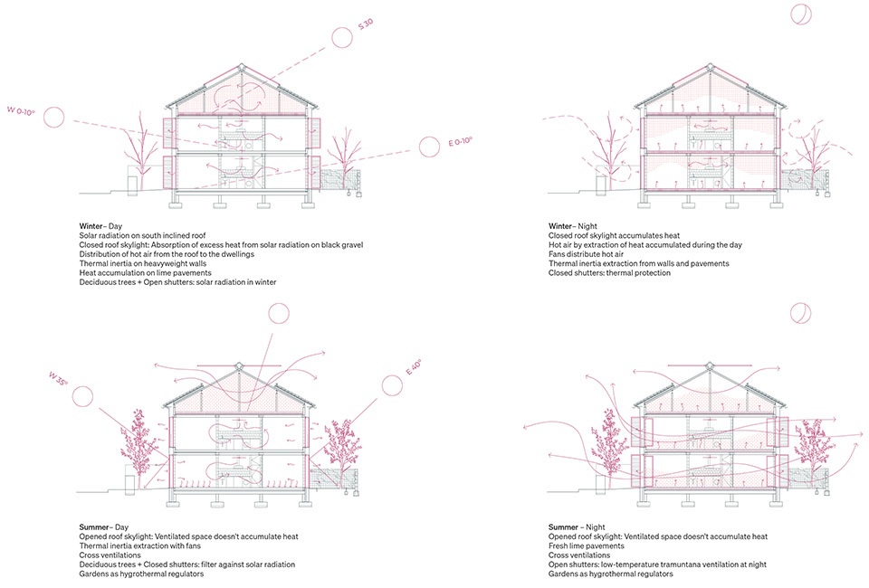 建筑通过策略性设计实现冬季最大化太阳得益与夏季降低冷负荷的目标,引入交叉通风、遮阳措施,并在地面与墙体中利用高热惯性,同时依靠湿度调节的吸湿性与透气性。屋面采用“Trombe”型设计,冬季蓄热、夏季通风,从而实现温度调节并消除对主动系统的依赖。私人庭院则作为用户可控的过滤装置,辅助住宅的通风系统。