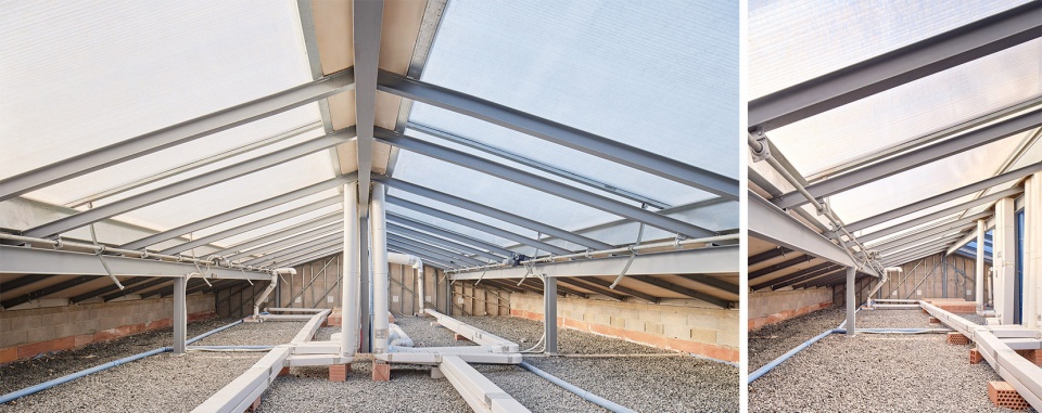 The building is strategically designed to maximise solar gain in winter and reduce cooling demand in summer, incorporating cross ventilation, solar shading, and high thermal inertia in floors and walls with humidity-regulating hygroscopy and breathability. The ‘Trombe’ type roof is a key element that captures heat in winter and is ventilated in summer, regulating the temperature and thus eliminating active systems. The private patios function as user control and filtering elements for the ventilation of the dwellings.