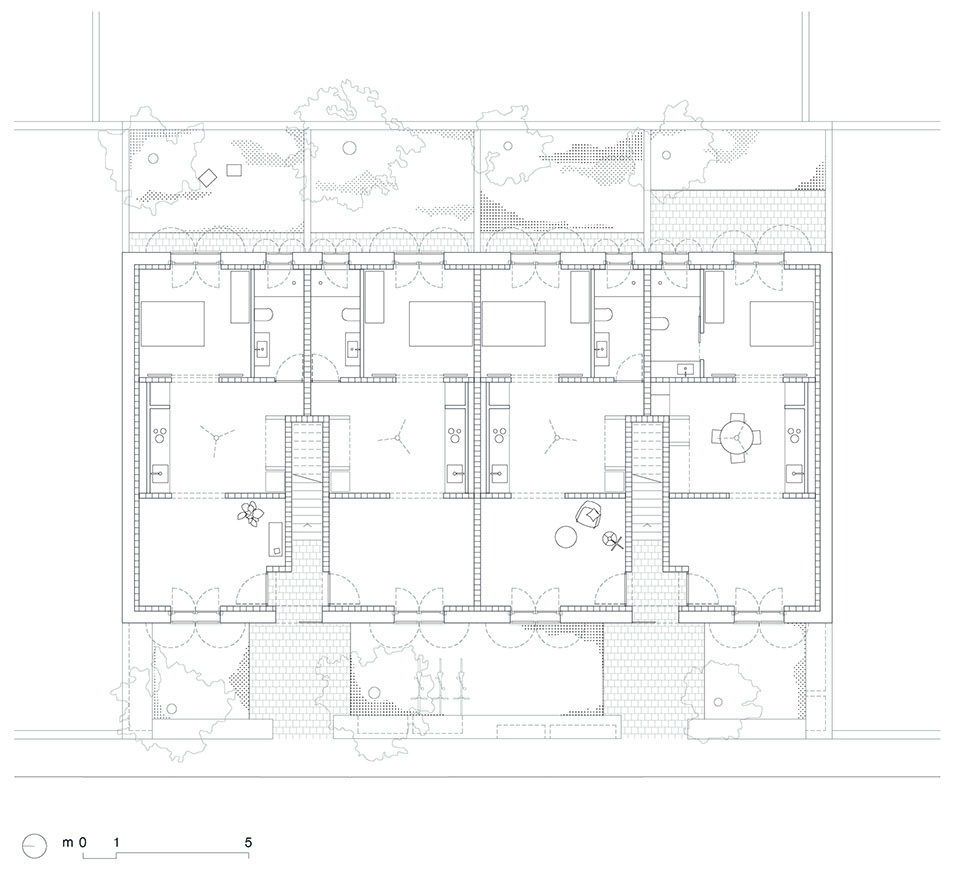 With two floors and a gable roof, the building is distributed into six dwellings, four on the lower ground floor and two on the upper level. The ground floor units have one bedroom and access to a private outdoor space, while the upper floor units have two bedrooms, each opening onto its own outdoor terrace. Open, flexible, and adaptable spaces are proposed that relate to each other directly, with the kitchen as the central space.