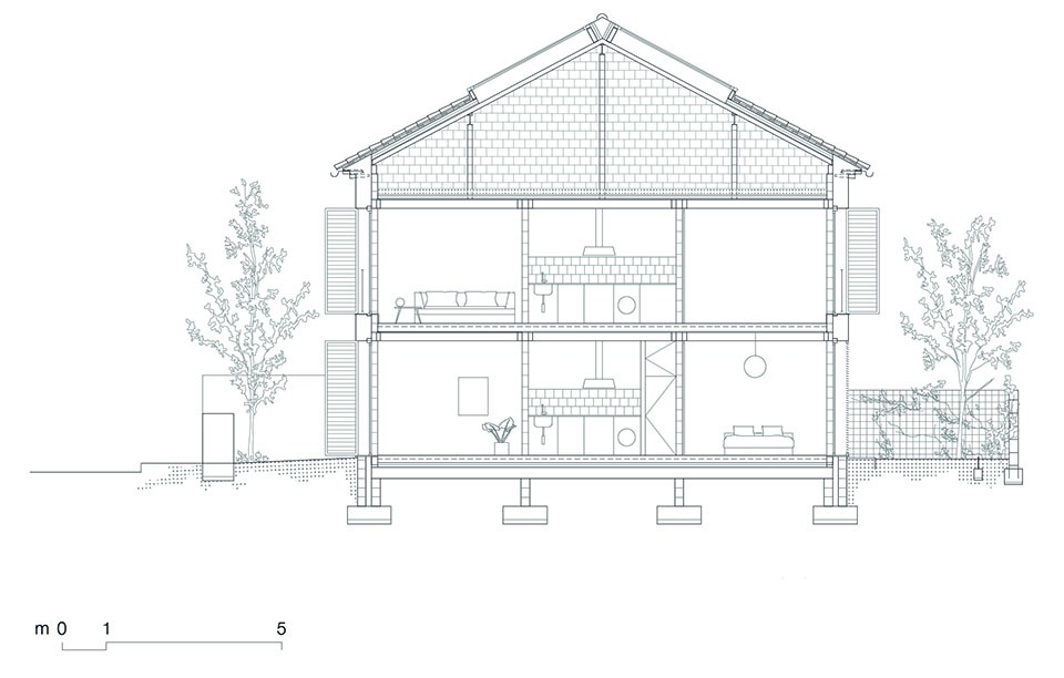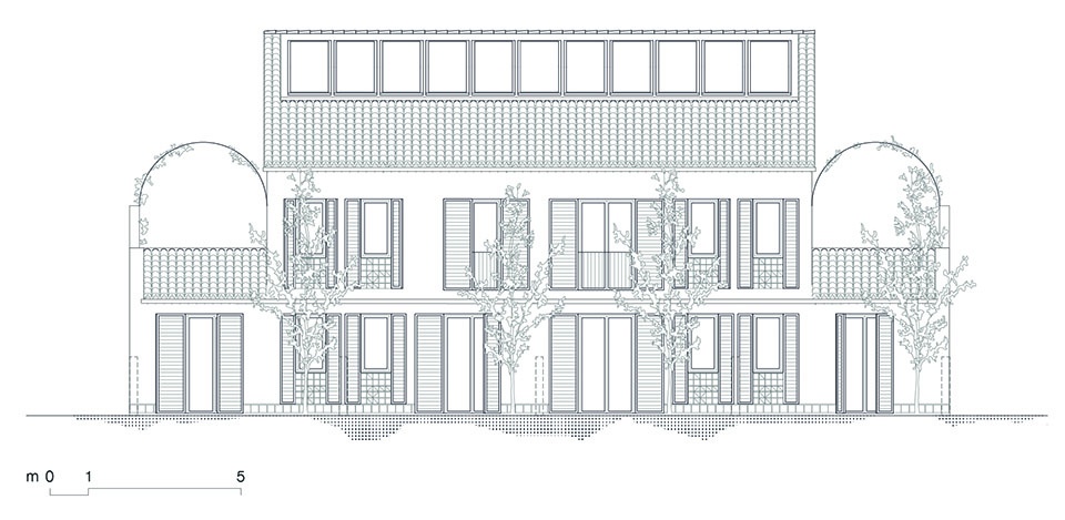 建筑共两层,覆以双坡屋顶,分布为六套住房:底层四套,上层两套。底层户型为一居室,并拥有私属户外空间;上层户型为两居室,每户均连接各自的户外露台。空间设计开放、灵活且可适应,相互之间直接联系,以厨房为核心空间。