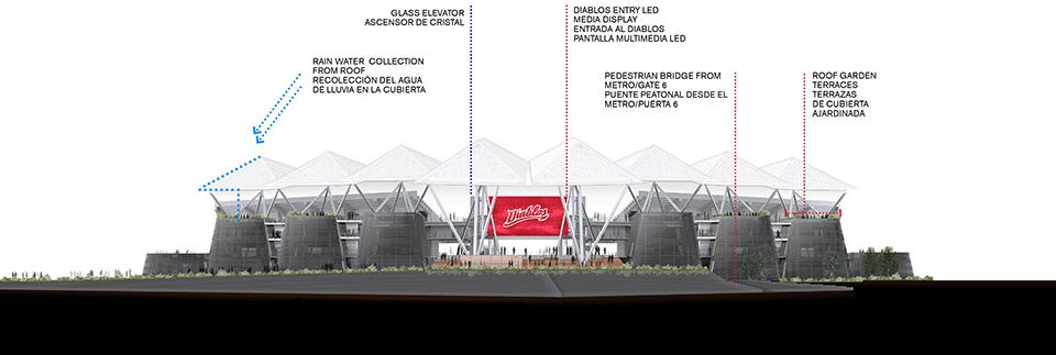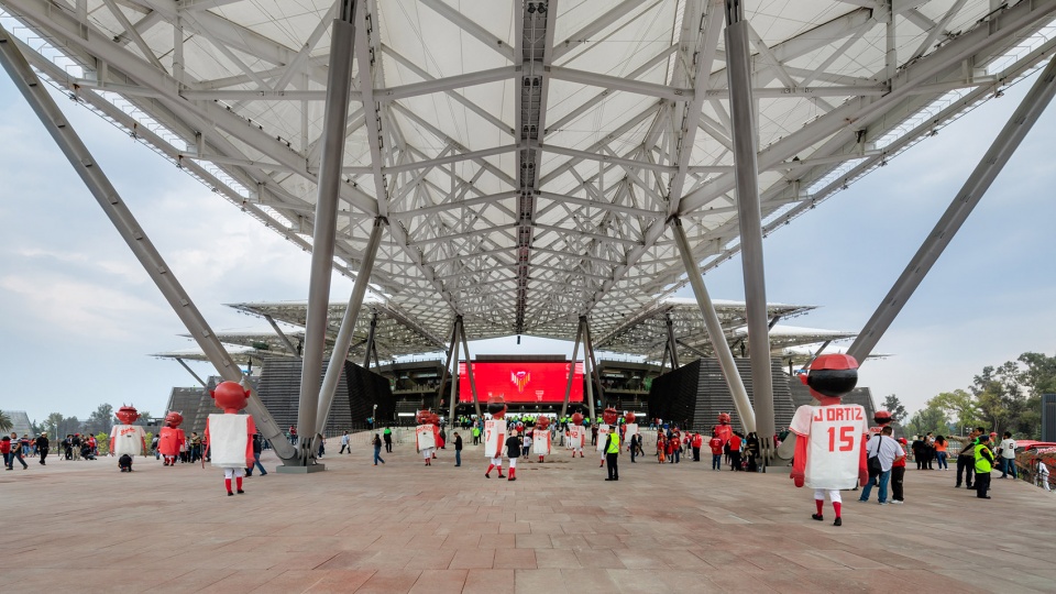 球场坐落于玛格达莱纳·米斯尤卡(Magdalena Mixhuca)体育园区内,紧邻一级方程式赛车赛道。这一建筑在实践与理论层面的尝试融合了现代与史前材料,以回应墨西哥的历史与文化,同时颠覆了传统体育场的范式。球场屋顶以三叉戟造型呼应球队“红魔”的名字,本身便是一项建筑技术的先进运用。屋顶由FGP Atelier设计,非公共内部空间由Taller ADG完成,而看台与公共流线则由FGP Atelier与Taller ADG合作完成.