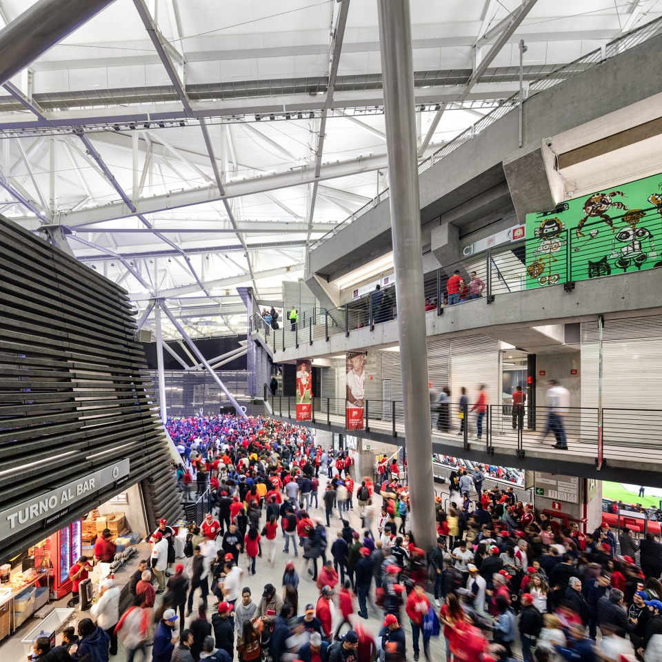 体育场本身营造出露天圆形剧场般的氛围,这主要得益于“悬浮”屋顶的视觉效果。场馆内设有11,500个带顶座位和8,500个外侧座位,均经过精心设计,确保观众能获得绝佳的比赛观感。除了设有可俯瞰球场的VIP包厢外,场馆还专门为周边社区预留了一定数量的低价座位。与此同时,设计在体育场外围设置了一圈公共广场,不仅为当地居民提供全年可运营的集市机会,以增加收入来源,也成为促进社区聚会与交流的重要场所。