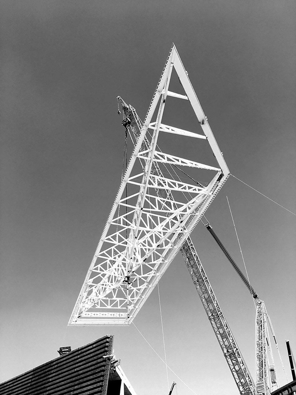 ▼采用了世界上最大的起重机将巨型桁架吊装就位,the largest crane in the world was employed to lift the massive truss structures