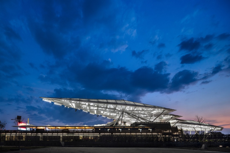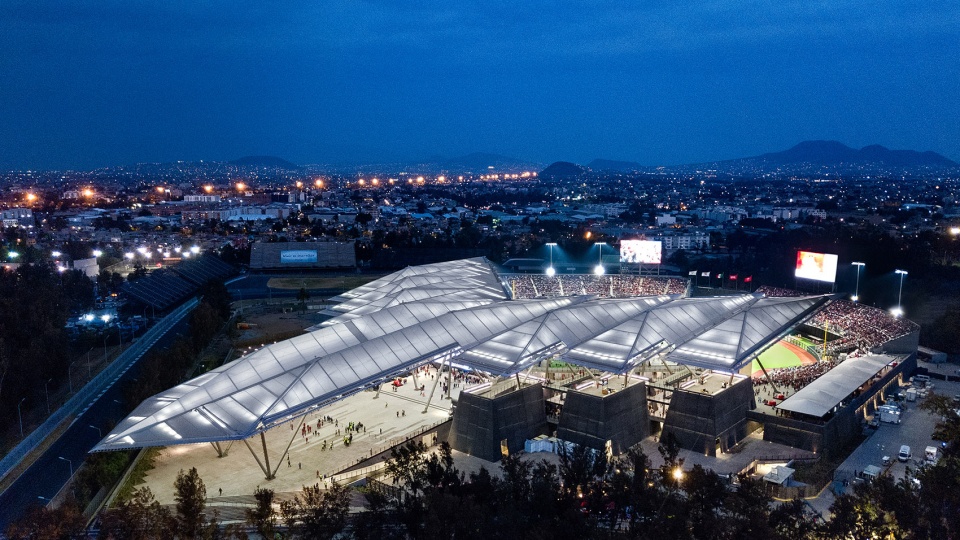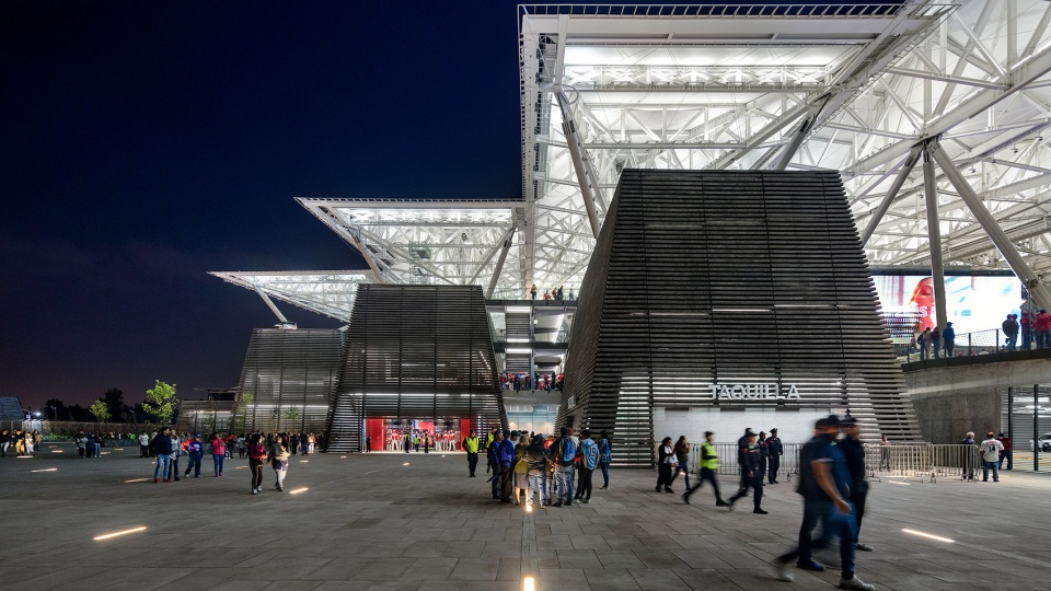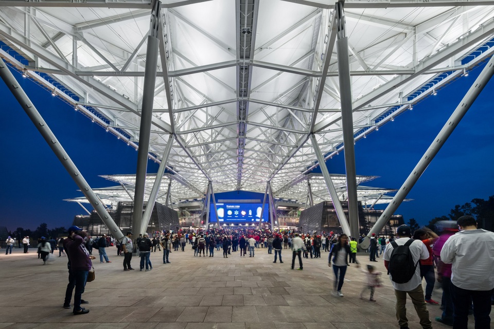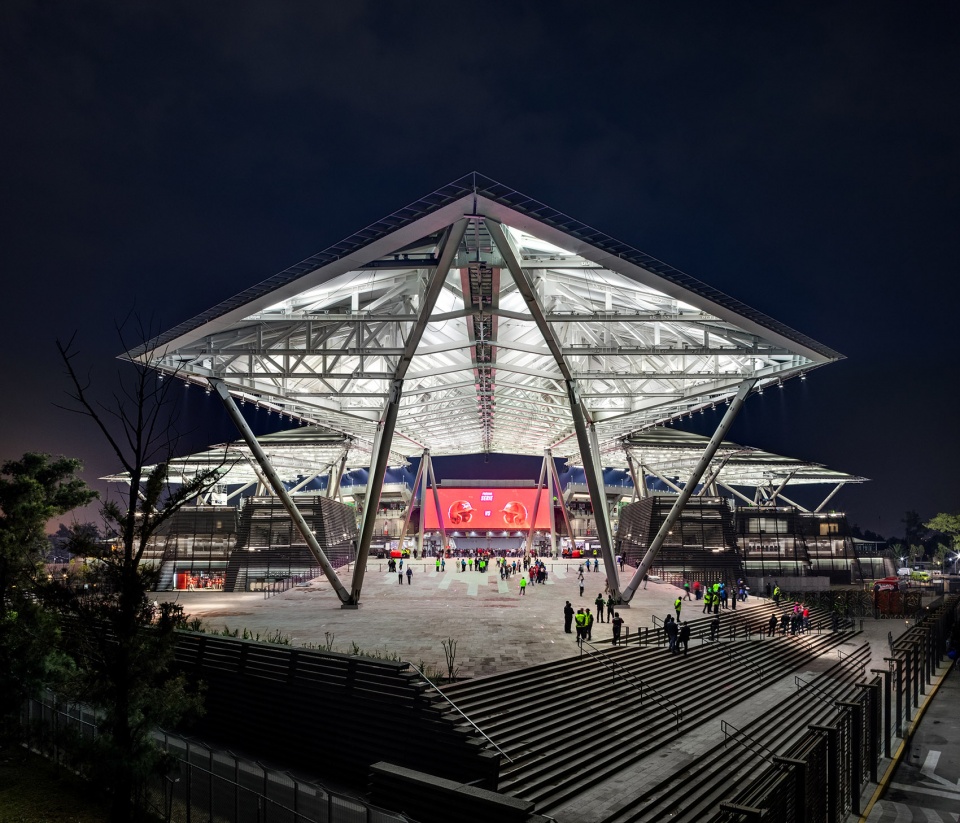 这座充满纪念性却依然轻盈的结构由钢材构成,并包裹以PTFE材料,与光影互动,呈现出独特的效果。在施工过程中,采用了世界上最大的起重机将巨型桁架吊装就位,并通过数字扫描技术确保精准的安装与对位。六座覆以本地火山岩的截顶金字塔状体量构成了建筑的基座,其顶部设有室外露台,配备餐饮摊位和社交空间,提供了远离场馆内部的交流场所。这些体量的形态与材质令人联想到中美洲古代庙宇,不仅唤起了墨西哥深厚的历史记忆,同时通过兼顾仪式感与创新性,营造出极具震撼力的入场体验。