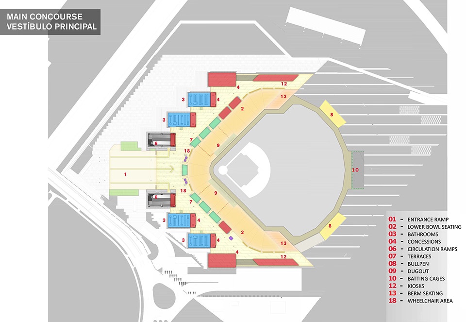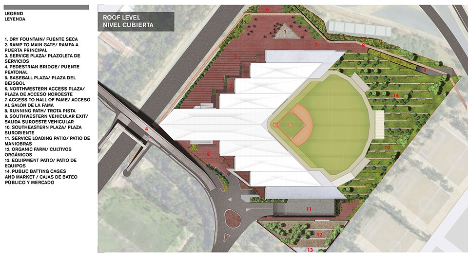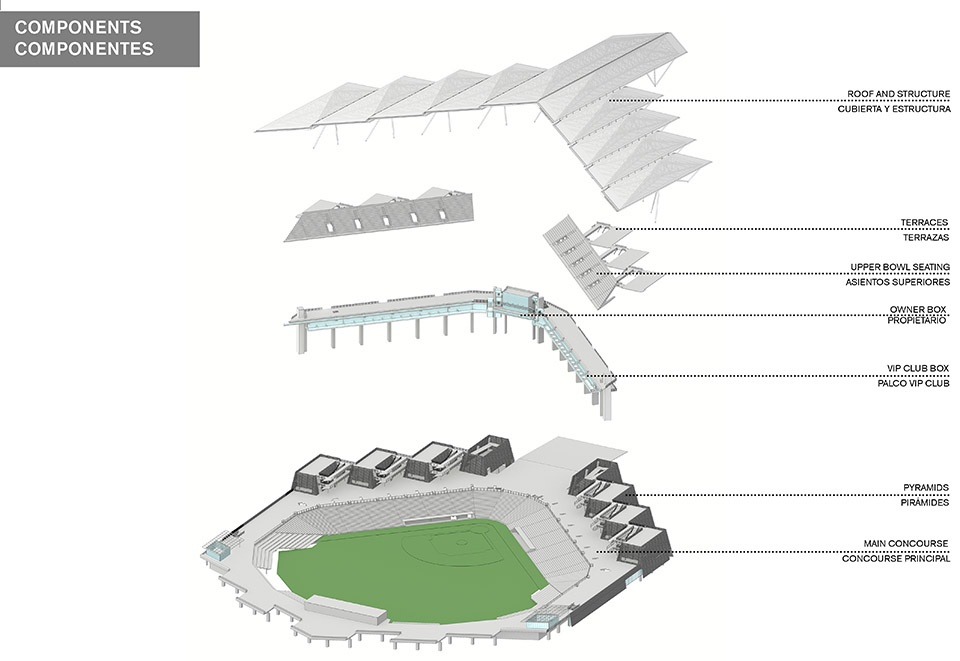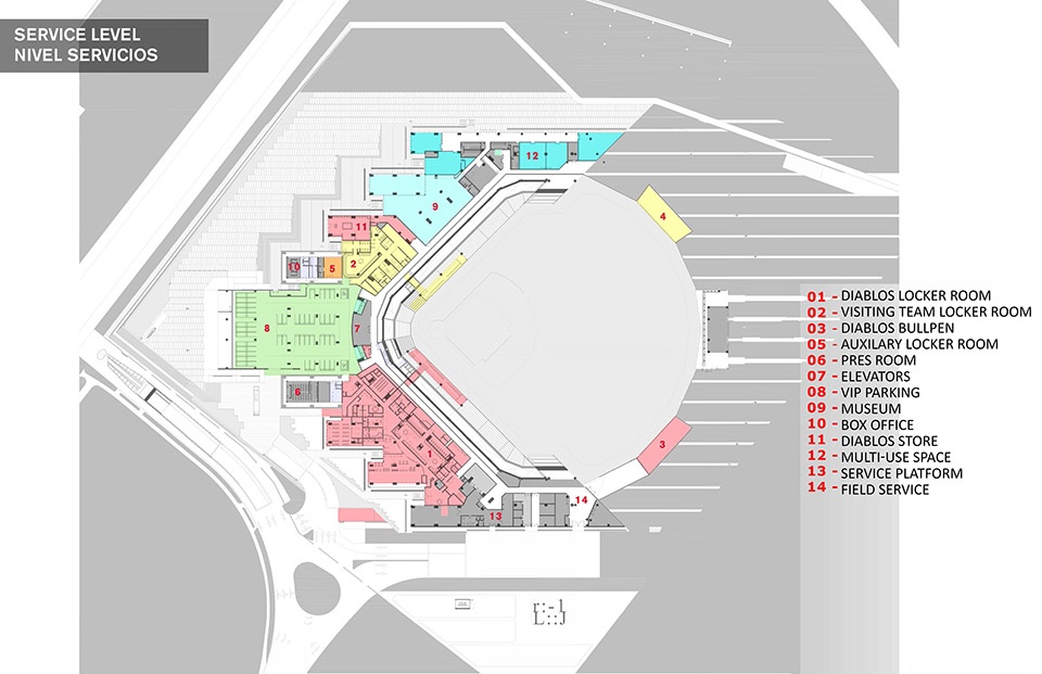 在赢得16次冠军、并作为墨西哥顶尖棒球队走过70余年辉煌历史之后,墨西哥红魔队终于迎来了他们的新主场。由墨西哥籍建筑师弗朗西斯科·冈萨雷斯·普利多(Francisco González Pulido)与阿隆索·德·加拉伊(Alonso de Garay)设计——前者来自总部位于芝加哥的FGP Atelier,后者来自墨西哥城的Taller ADG——阿尔弗雷多·哈普·埃卢球场(Alfredo Harp Helú Stadium)是迄今为止墨西哥最大的棒球场,可容纳20,000名观众,远远超过了球队此前仅能容纳5,200人的弗赖·纳诺球场。作为棒球爱好者、球队股东,以及著名的墨西哥企业家与慈善家,埃卢委托德·加拉伊设计这一世界级场馆,并邀请冈萨雷斯·普利多合作主持设计。新球场不仅配备了为球队和球迷提供完善服务的全面设施,更肩负着在墨西哥重振棒球运动、营造社群氛围与文化认同的更大使命。