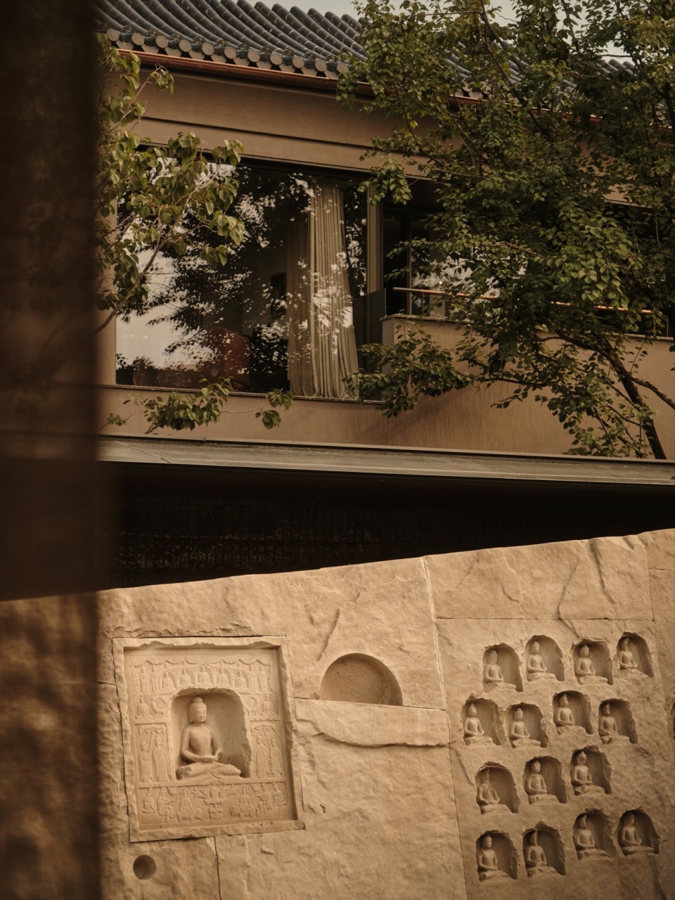 The experience of arriving at the guest rooms is carefully choreographed as a layered spatiotemporal drama: The main courtyard integrates the landform of Datong’s grottoes with modern geometric language, offering a cultural impact that gazes upon the history of Northern Wei’s Pingcheng and the Silk Road; strolling forward, bronze doors open, leading to deep courtyards where water mirrors the sky and curtains sway, evoking the imagination of Shanxi dwellings; ascending high, the city wall and gate tower are faintly visible, creating a dialogue across time. With five successive courtyards and meandering water features, impressions of Datong unfold step by step.