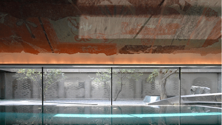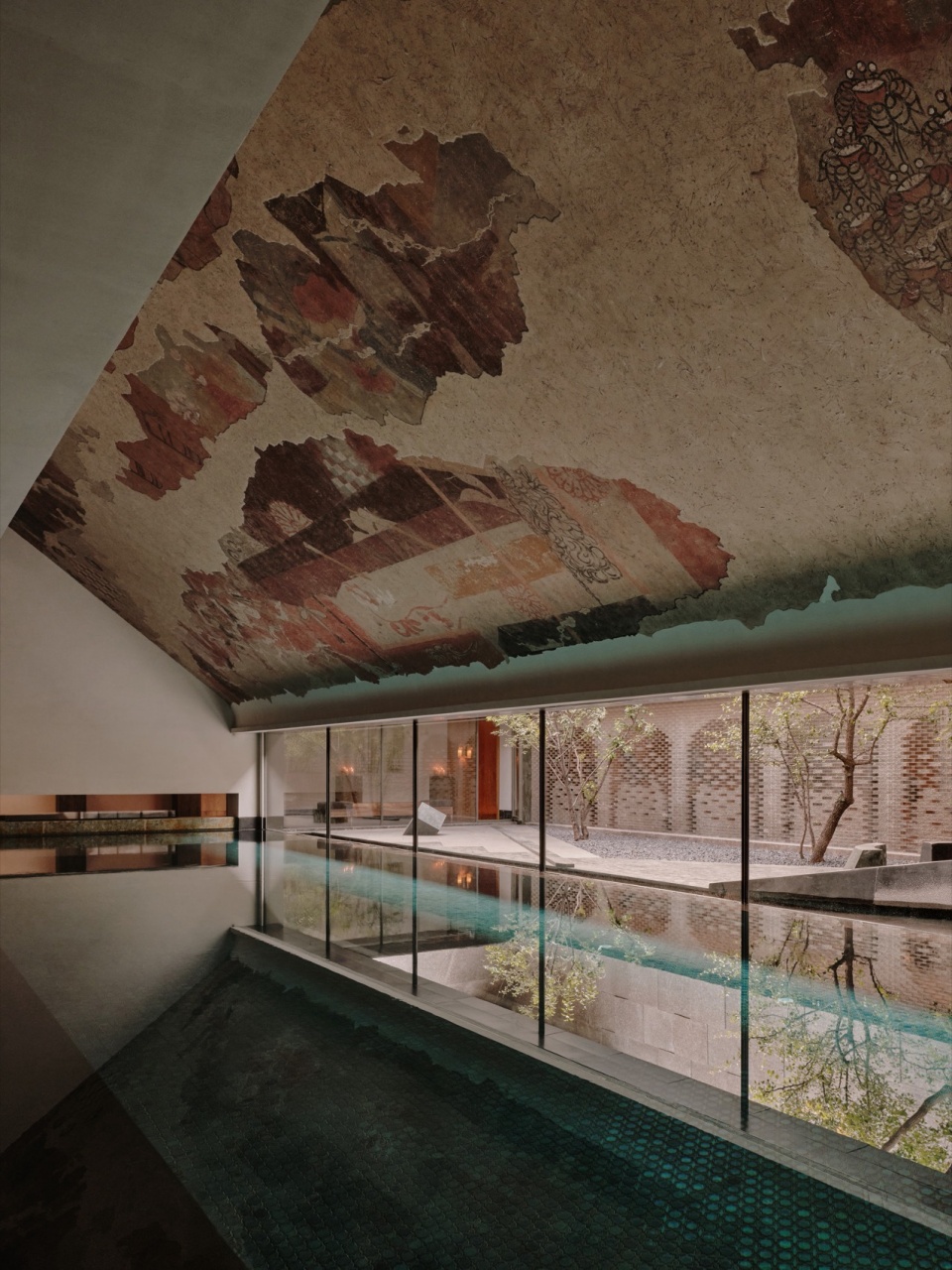 作为整座酒店体验的高光,地下泳池则如同从天然山体中凿刻出来。巨大的斜壁从地上一直延伸至地下,其上的壁画由云冈研究院主持壁画修复的艺术家高平传老师创作。当天窗光线投下,水光在斜壁上的壁画上跃动,留下天然洞窟般的质朴体验。