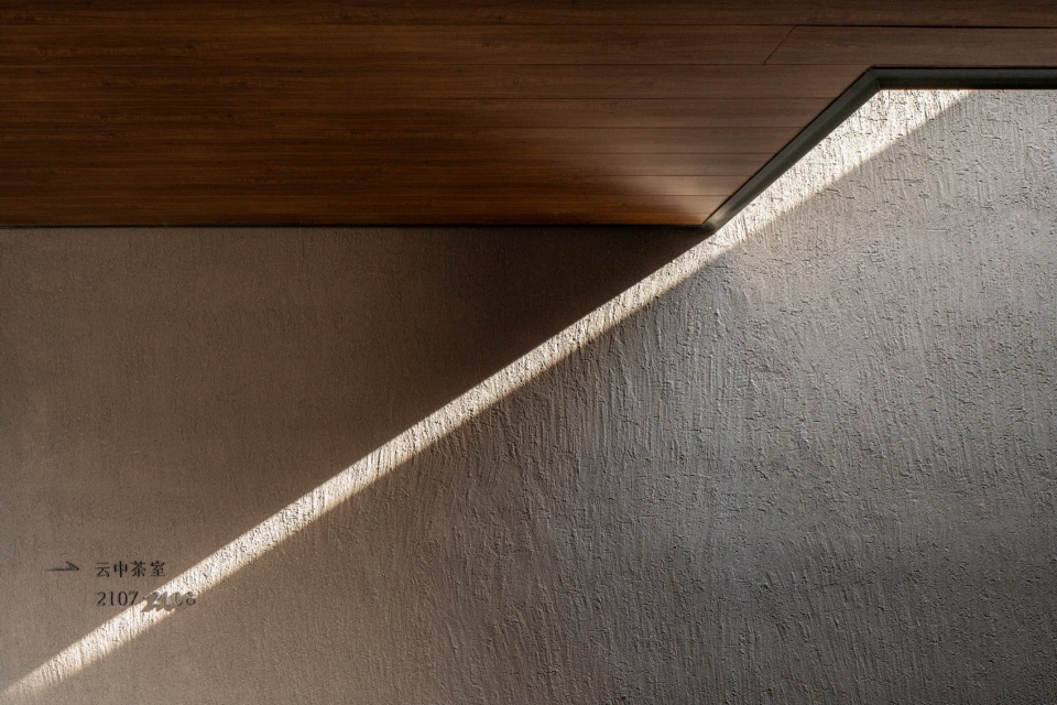 Using the light-receiving properties and colors of different materials creates an atmosphere of light for the space: Arc-shaped solid forms are hidden within the perforations of the feature wall, creating an effect reminiscent of flickering Buddhist shadows in the sunlight; low-reflectivity tiles diffuse their color along the corridors in the morning and evening light; wooden ceilings become canvases for shimmering water reflections.