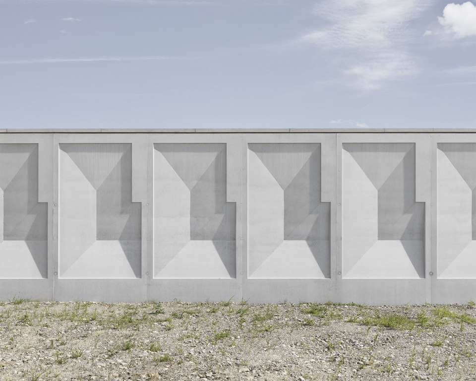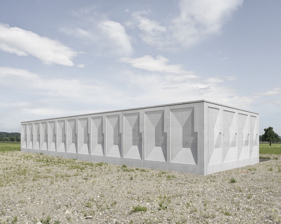新的抽水站采用混凝土浮雕立面,出于安全原因不设窗户。混凝土立面的重复性浮雕将建筑划分并赋予结构感。随着阳光角度的变化,这一浮雕效果也会呈现不同的视觉强度。由于建筑独立矗立于空旷草地之上,这种立面肌理被设计为在远距离外亦可感知。