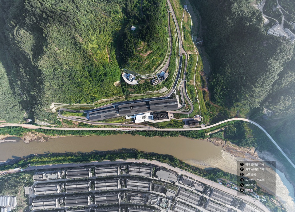 Following History, Reconnecting Ancient and Modern: We preserve the site’s DNA, reorganize the spatial order, and construct a temporal axis extending from the banks of the Chishui River into the mountains. The plan intentionally retains old fermentation pits and restores ancient distillery workshops from the late Ming/early Qing dynasty and the late Qing/early Republic of era to serve as production spaces. A landform-building for cultural exhibition connects with the 1980s production workshop, while a reception center and a storage cellar with a modern sculptural quality stand at the higher elevation. The visitor route follows a chronological timeline from the Ming and Qing dynasties, through the modern era, to the contemporary age. Starting from the riverbank and ascending step by step, it forms an immersive historical experience sequence.