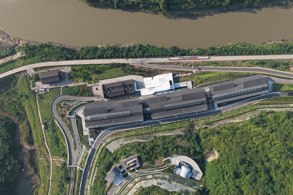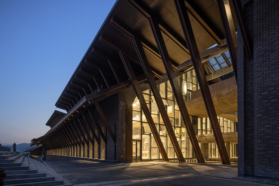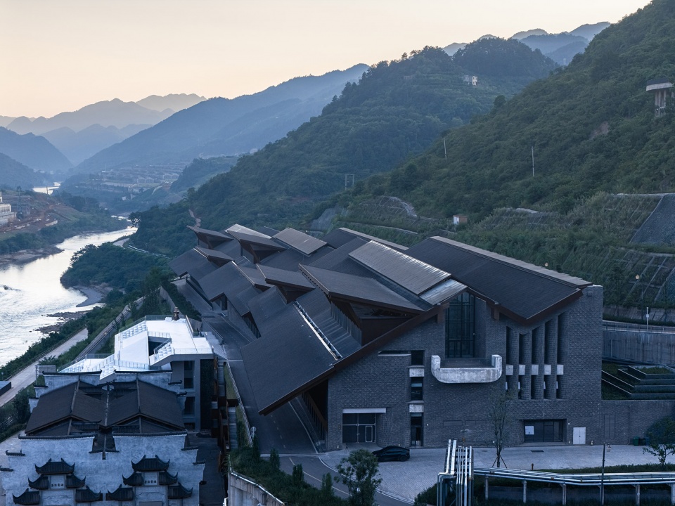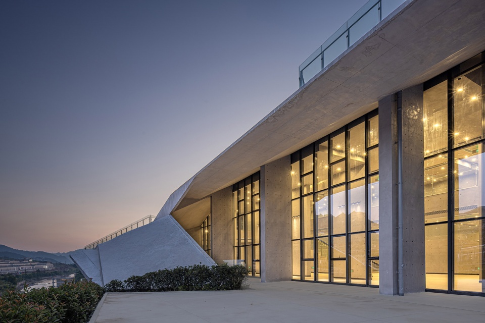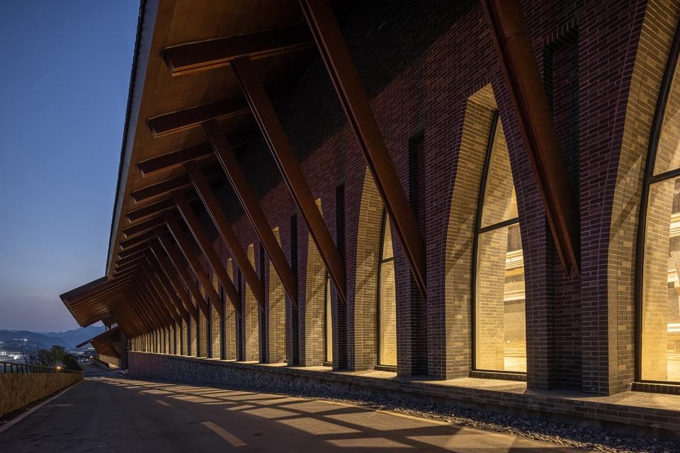 The landform architecture connects the ancient workshops with the 1980s workshops, bridging an approximate 18-meter elevation difference across the site. It houses functions such as cultural exhibition, rest, and exchange, serving as a cultural way-station during the tour. Employing fair-faced concrete as its primary language, the building’s texture is both lightweight and serene. Conforming to the terraced landscape, it subtly blends into the natural texture of the site. Three folded roof planes stack upwards along the mountain slope. Embedded with footpaths and stairs, these roofs not only guide visitors upward but also offer places to pause and enjoy the views, achieving a poetic integration of people and landscape.