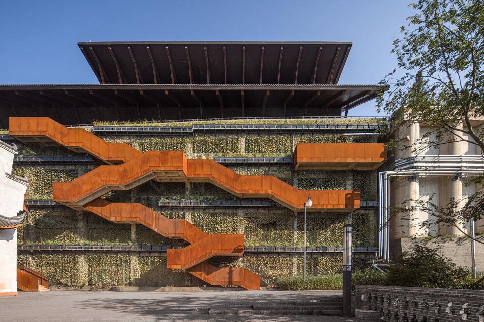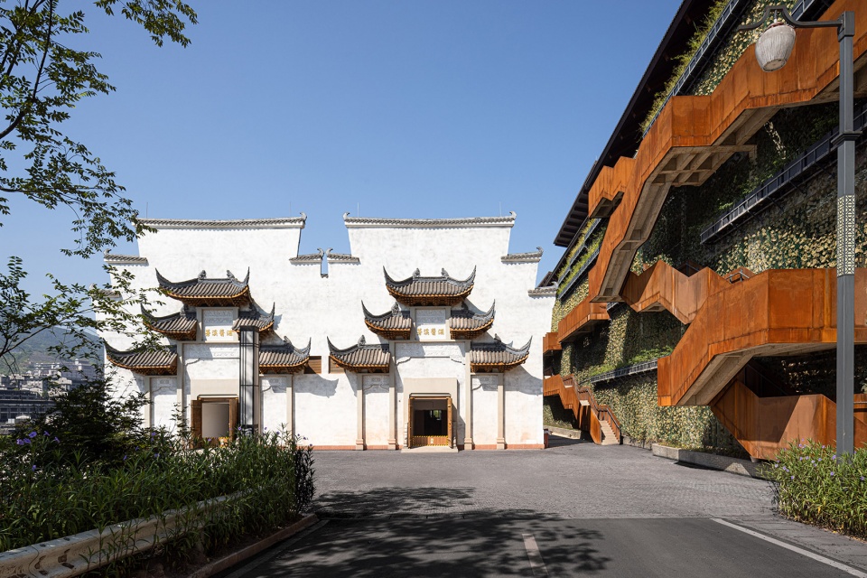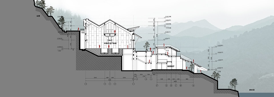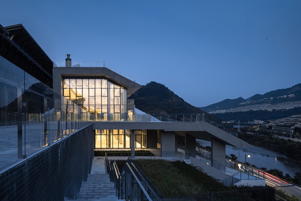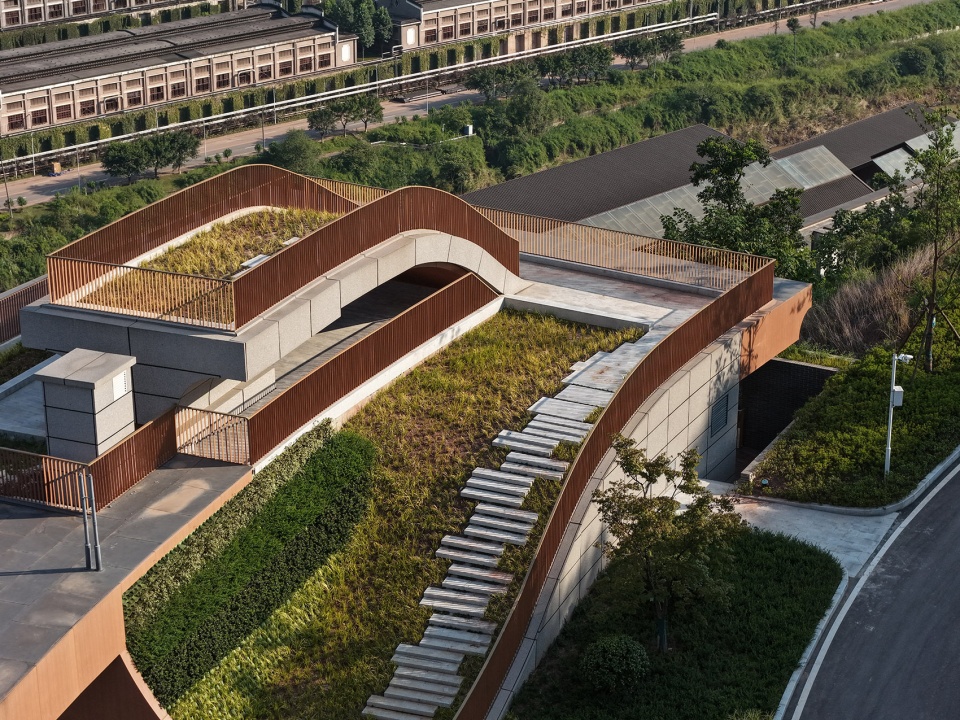 地景建筑连接古作坊与上世纪80年代车间,连接上下约18米的场地高差,涵盖文化展览、休憩交流等功能,是游览途中的文化驿站。建筑以清水混凝土为语汇,质感轻盈而肃穆,顺应台地起伏,悄然融于自然肌理。三片折形屋面依山叠升,屋面嵌入步道与阶梯,既引导游人上行,也可驻足观景,实现人与山水的诗意交织。