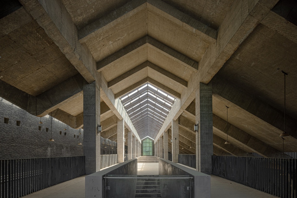 Natural light filtering through the roof interweaves with the orderly structural framework to create a solemn, rhythmic play of light and shadow, guiding visitors into a dialogue with time and space.