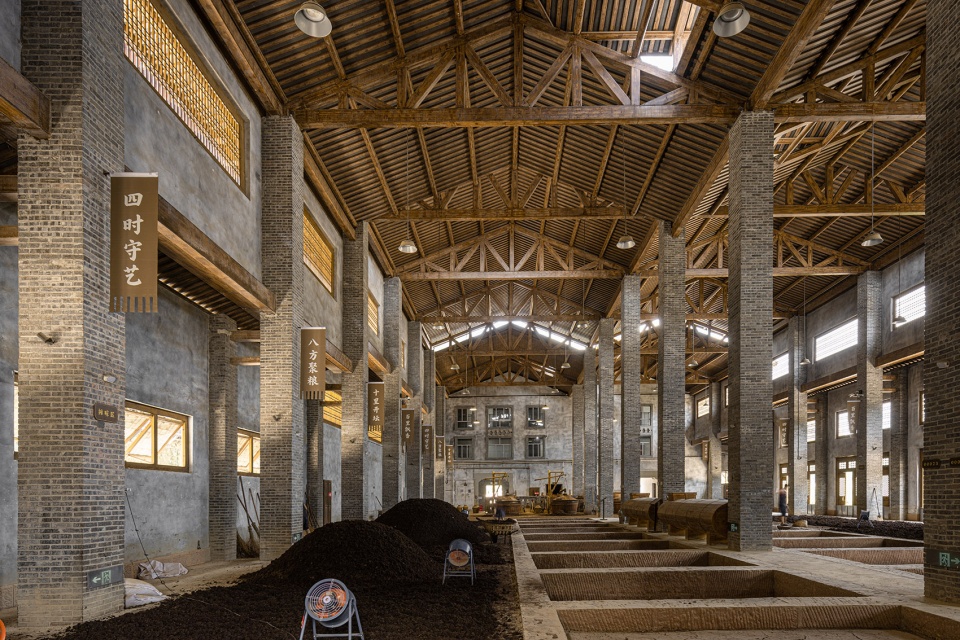 Three production workshops from the 1980s stand quietly above the cluster of ancient workshops, forming the climax of the tour sequence. They integrate brewing production, visitor tours, exhibition storage, and administrative offices.The architecture draws inspiration from the forms of mountainous settlements in Southwest China, with undulating roof profiles that echo both regional characteristics and the imagery of a distillery, while also providing excellent ventilation for the workshop. The facade, through a rhythmic interplay of wooden frames and window openings, creates a cadenced architectural expression. The interplay of light and shadow within resembles a silent symphony of fermenting Qu.