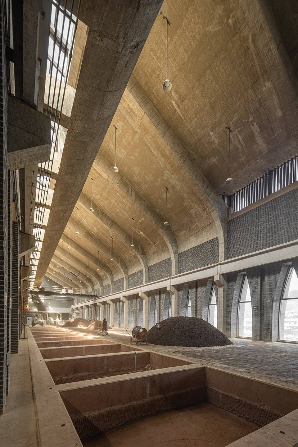The interior concept is inspired by ancient wine storage caves. Chamfered details at turns soften the abruptness of continuous components, reflecting the craftsmen’s natural philosophy regarding the flow of time in brewing. Smooth curved forms, orchestrated by light and shadow, envelop both people and fermentation pits within the mountain. Skylights and side windows precisely introduce natural light, casting beams into the humid environment upon the workers. Here, heaven, earth, people, and wine merge into one, becoming a highly ritualistic experiential node in the tour.