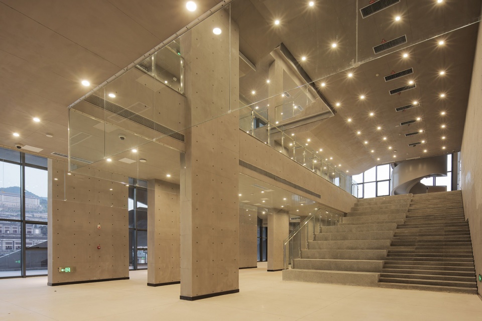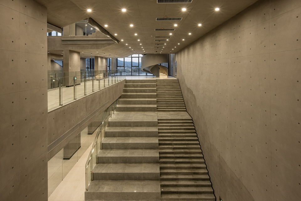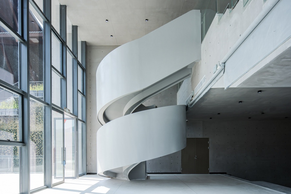 The interior continues the fair-faced concrete theme, creating simple and focused spaces. A grand staircase, a spiral staircase, and a full-height atrium intertwine to create a rich visual dialogue, enhancing the immersive exhibition experience through the interplay of “seeing” and “being seen.”