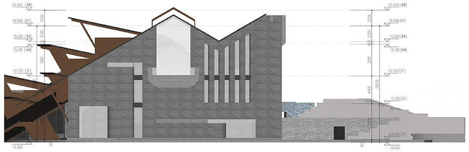 Materials:Blue brick, stone, wood, aluminum panel, concrete, glass curtain wall