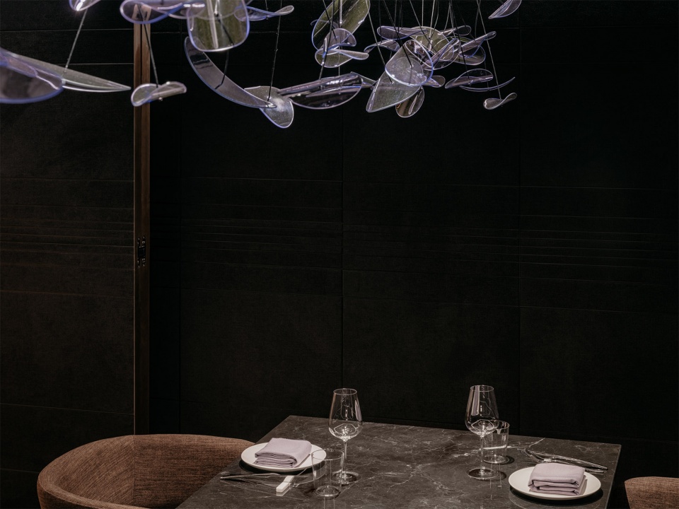A side corridor rises past the open kitchen, illuminated by step lights and glowing slits that reveal glimpses of the floral crown. The mezzanine unfolds gradually into a walnut-and-velvet lounge, where geometry shifts subtly off-axis, creating intrigue. A mirrored antique-bronze canopy expands the low ceiling, etched with abstract floral motifs that align perfectly with the lighting; a quiet, elevated “sky. In the private dining room, a stardust installation suspends smoky-violet petals in loose constellations above the table. Against a dark textile backdrop, attention returns to food, conversation, and intimacy. Here, stone and timber give way to velvet and woven fabric, ensuring every touch feels soft, warm, and inviting.