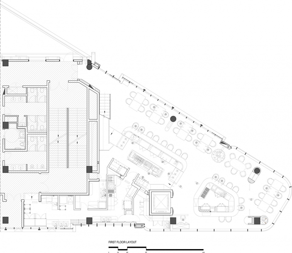 Arrival begins at the flower’s heart: a circular bar anchors the room, paired with a wraparound dining ring at the open kitchen to form a unified FOH/BOH stage. The bar functions as both social hub and production deck. Diners at the chef’s counter are within arm’s reach of mise en place and plating, engaging directly with the culinary process.