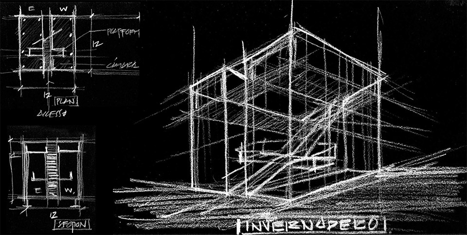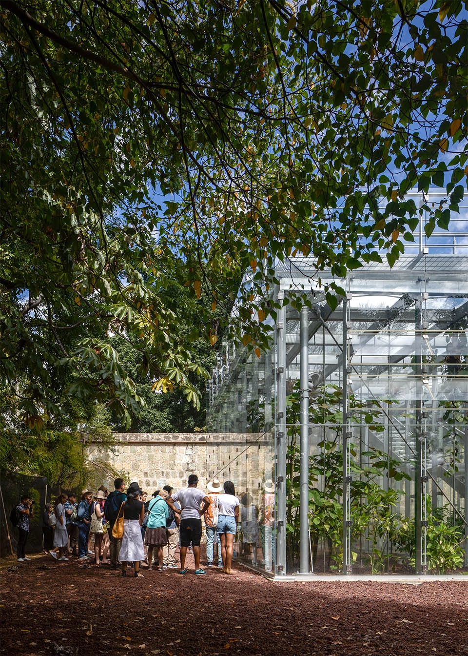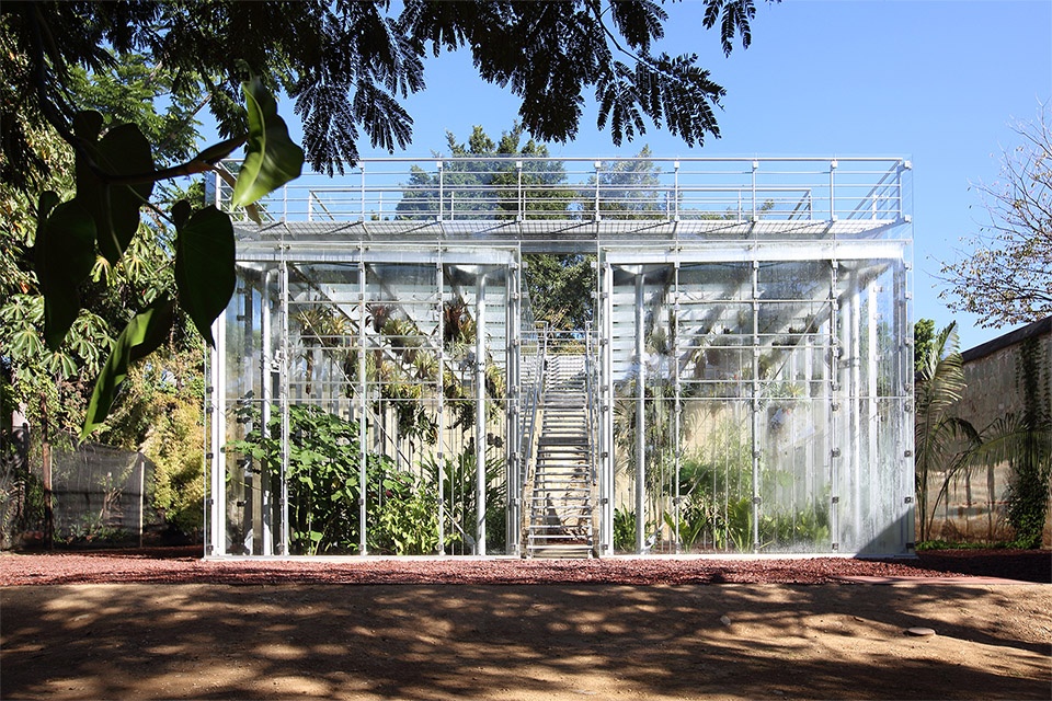 In the summer of 1994, Mexican Artists Francisco Toledo and Luis Zárate and the Anthropologist and Biologist, Alejandro de Avila began creating the cultural ensemble that would become the Botanical Gardens of Santo Domingo. They hoped to crown their achievement with a pavilion for growing diverse species, conducting experiments, and teaching the community. After the design of the pavilion started with Chicago-based architect Francisco Gonzalez Pulido, it quickly became clear that the Pavilion should reflect rather than compete with this context. It was important to create a lens through which this context could be seen and refined as well as a platform for learning more about this context and its ecology in the future.