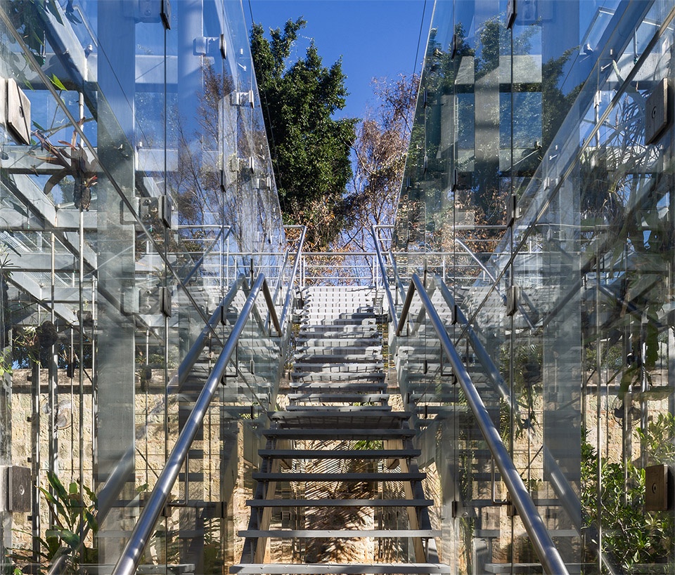 The conditioning is provided through a geothermal system that injects cold air into the chambers from the underground soil via 2 air-handling units that are powered by solar panels. The central staircase brings the visitors through the chambers up to the viewing platform from where stunning views into the church and the botanical gardens can be experienced as well an opportunity to contemplate the curated plant content from an elevated perspective. Underneath the staircase, rainfall is collected and stored to be used by the evaporative cooling system that supports the cooling and irrigation systems.