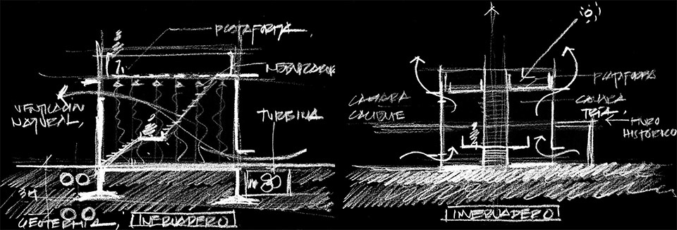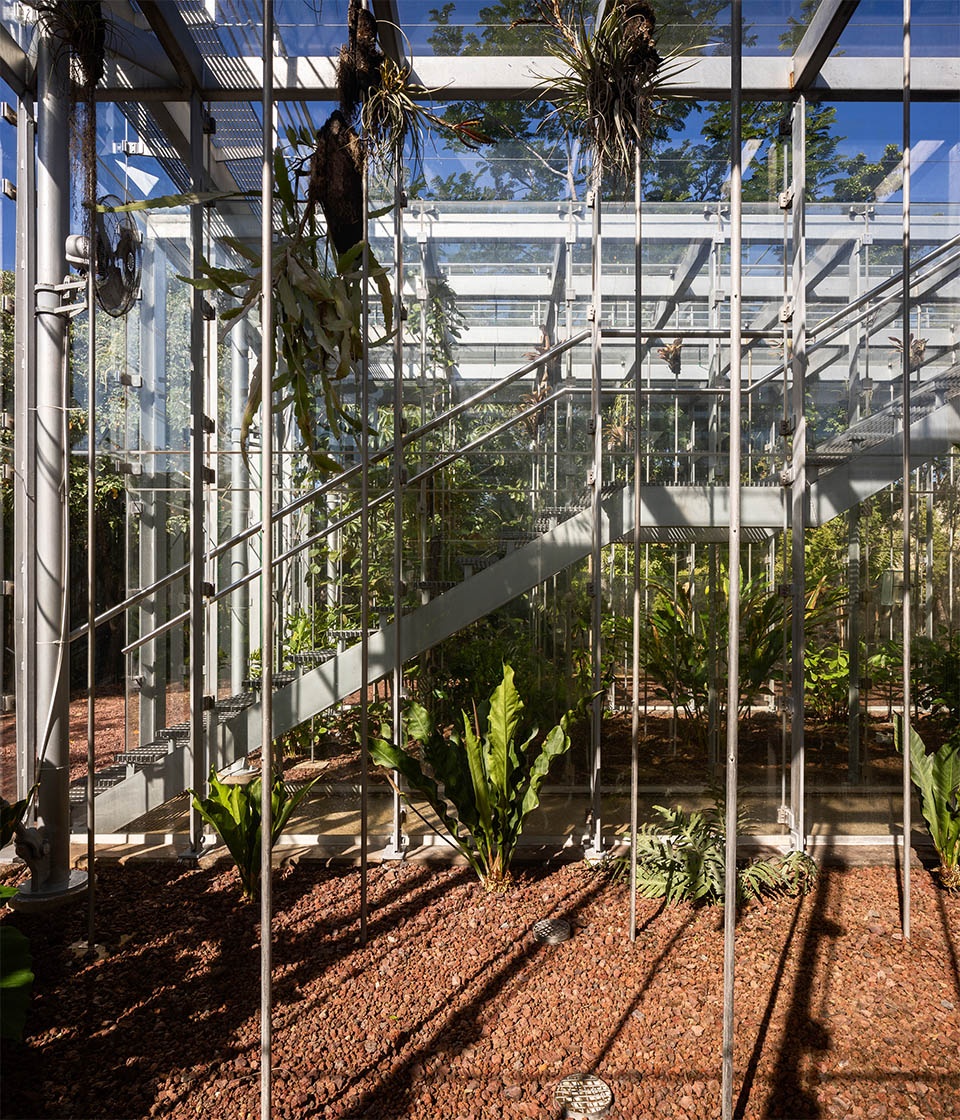 The idea of total transparency was critical in the design. The flooring planks for the staircase and the viewing platform are an open grid to allow light and views from all directions into the chambers. Its design is based on five elements: the west chamber (hot chamber), the east chamber (cool chamber), the central staircase (which collects rainfall), the viewing platform, and the geothermal system. The east and west chambers are rectangular glass boxes oriented on the north-south axis to provoke natural cross ventilation. They are located on either side of the central staircase and designed to run on very different thermal criteria.