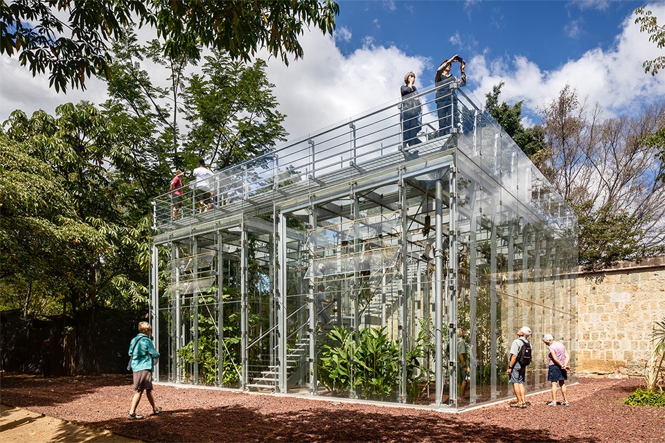 1994年夏天,墨西哥艺术家弗朗西斯科·托莱多(Francisco Toledo)、路易斯·萨拉特(Luis Zárate)以及人类学家兼生物学家亚历杭德罗·德·阿维拉(Alejandro de Avila)共同着手打造一个文化组合体,后来发展成为圣多明各植物园。他们希望以一座亭阁为这一成就加冕,用于培育多样物种、开展实验,并面向社区开展教育。亭阁的设计由总部位于芝加哥的建筑师弗朗西斯科·冈萨雷斯·普利多(Francisco Gonzalez Pulido)主导,在设计初期便很快明确:这座亭阁不应与环境竞争,而应予以回应与映照。重要的是创造一个“透镜”,通过它来观照和提炼这一环境,同时也成为未来深入理解其生态与文化的平台。
