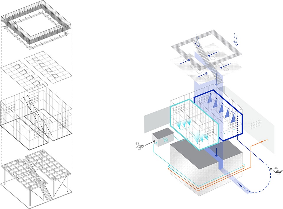 在设计过程中,“完全透明”的理念至关重要。楼梯与观景平台的地板采用开放式格栅铺板,使光线与视线能够从各个方向进入室内空间。亭阁的设计基于五个要素:西侧温室(热室)、东侧温室(冷室)、中央楼梯(用于收集雨水)、观景平台以及地热系统。东西两侧的温室为矩形玻璃盒体,沿南北轴线布置,以激发自然交叉通风。它们位于中央楼梯两侧,并按照截然不同的热工标准进行设计。