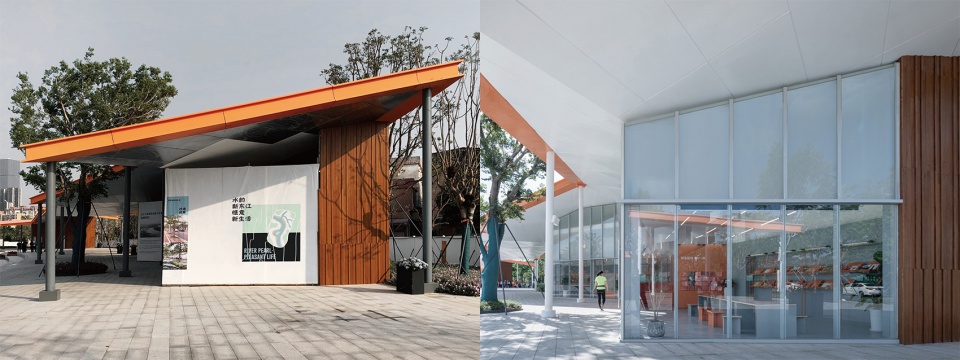 龙湾湿地公园作为三江六岸滨水岸线的核心节点,被规划为第一期示范段,由奥雅景观设计完成改造。展览《莞潮·三江六岸活力新生》即设于湿地公园主入口广场,展厅坐落在蜿蜒的廊架之下,由梓集fabersociety改造设计。改造前,这里曾处于杂乱、无功能的状态,并由临时围挡围合封闭起来。改造后,展厅面问龙湾开放,实现与湿地公园的融合。