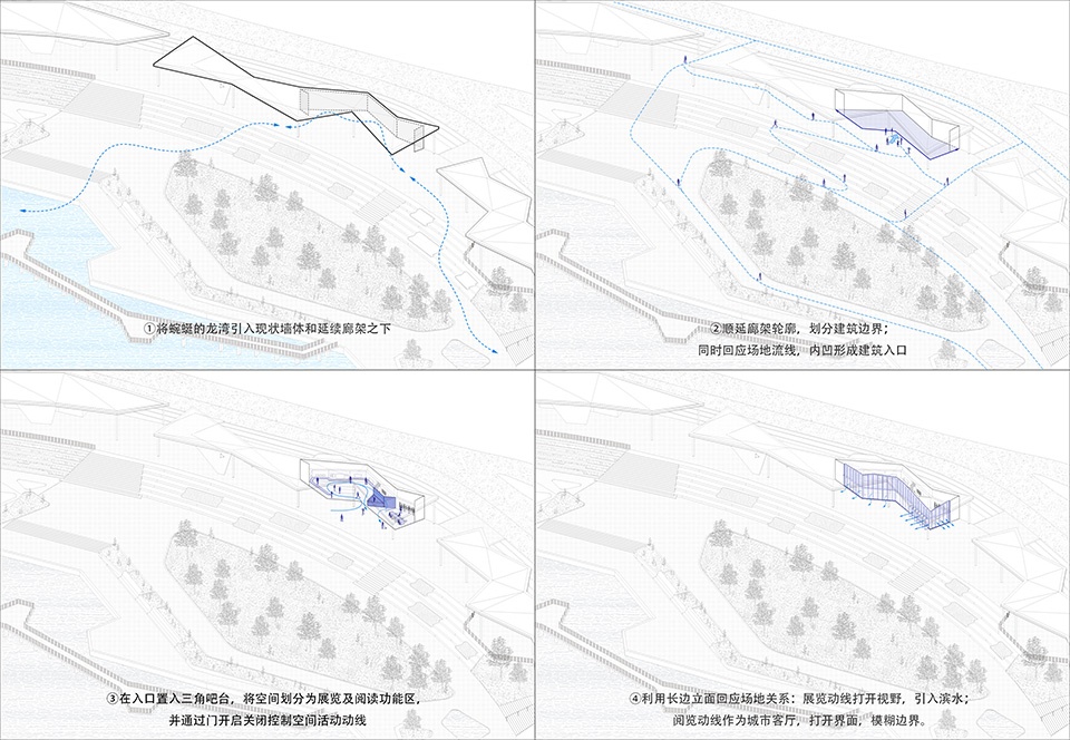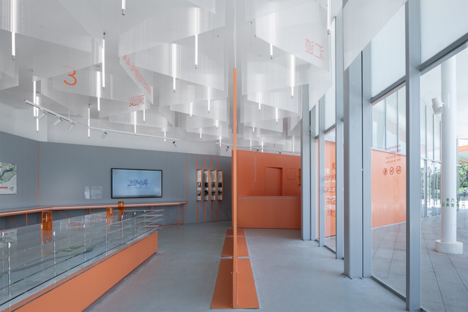本次展览以水文化为脉络,将龙湾引入展厅之中。展厅依托延续的屋面廊架和现有墙面,沿河岸与屋檐展开,回应场地边界,形成可供市民游览与阅读的多功能复合空间。设计通过打开建筑立面、采用“上实下虚”构造、开放下部玻璃,将湿地景观引入室内,实现展厅与公园的互融,使自然成为展览叙事的一部分。
