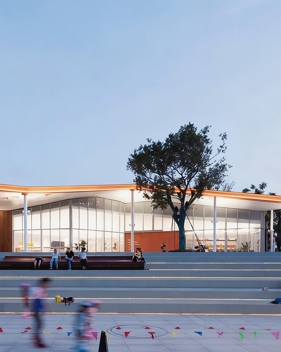At sunset, the park glows in golden light, and people come out from their homes, filling the space with joy. Laughter, footsteps, lively conversations, games, singing, and dancing bring the park to life. The exhibition hall is envisioned as a calm, reflective corner within the wetland park, yet open and welcoming, embracing Longwan.